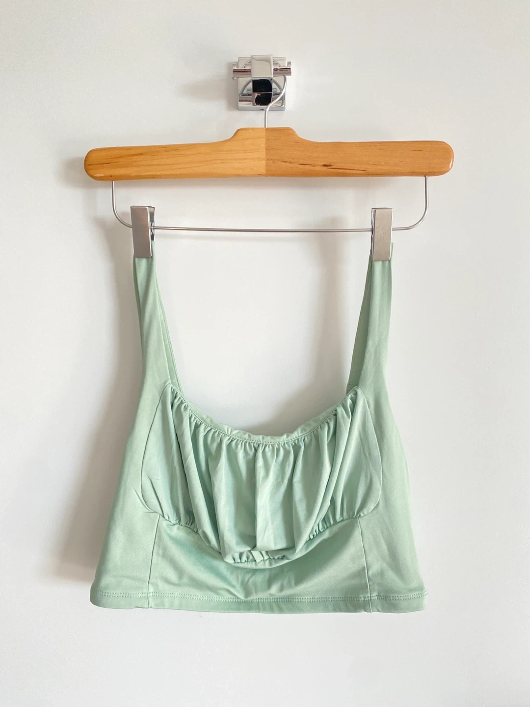 A cute mint green crop top with ruched bust detailing that looks very flattering and makes the girls look fuller if you are small chested. Size M ❤️Check out my other listings!
