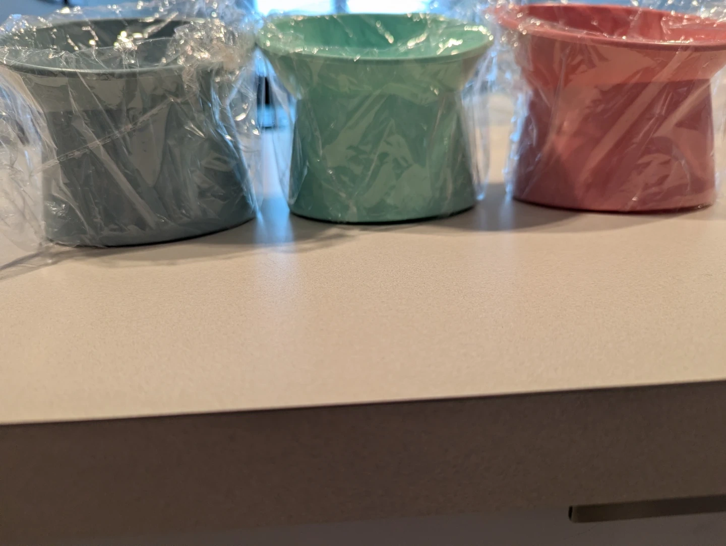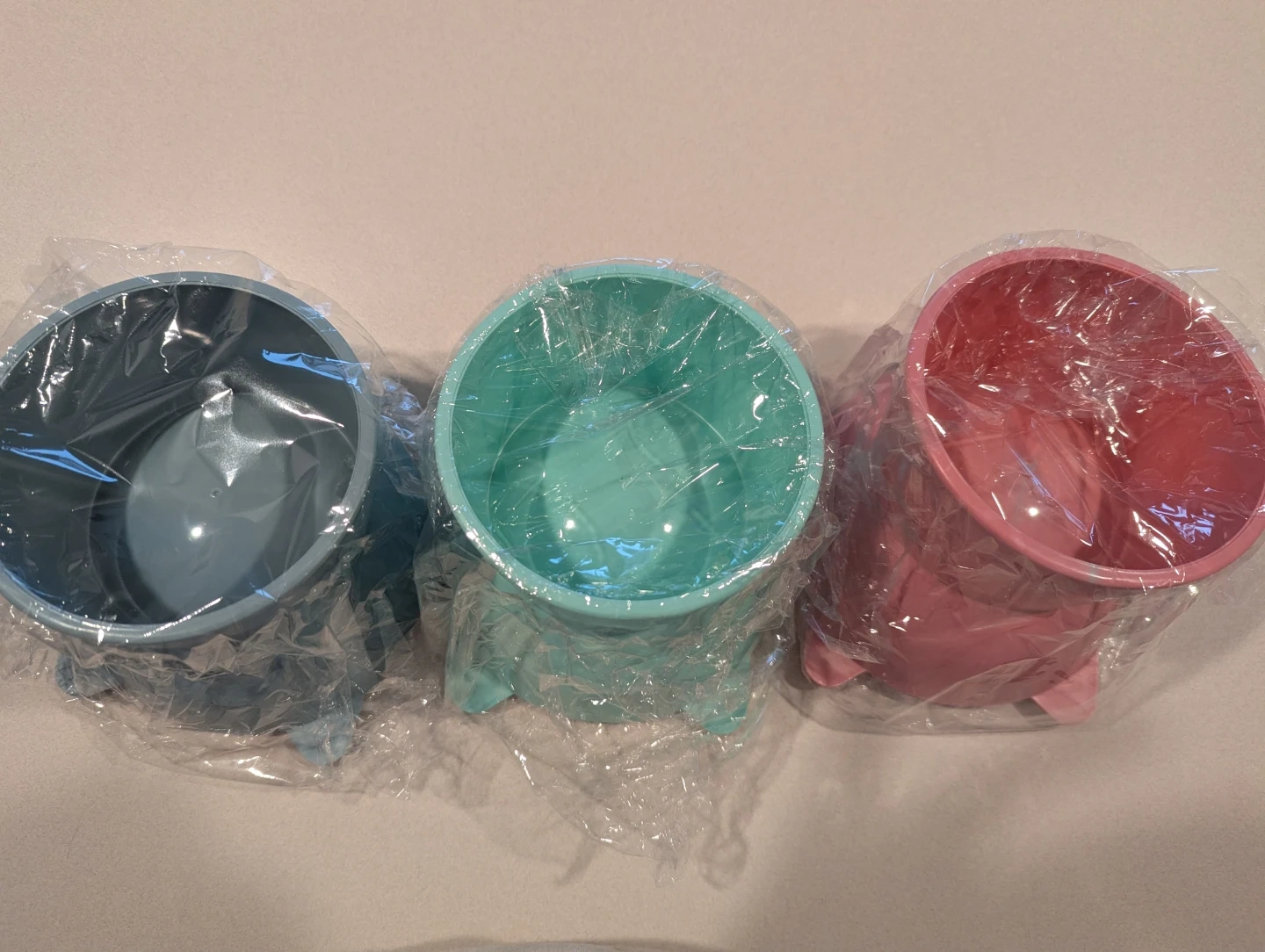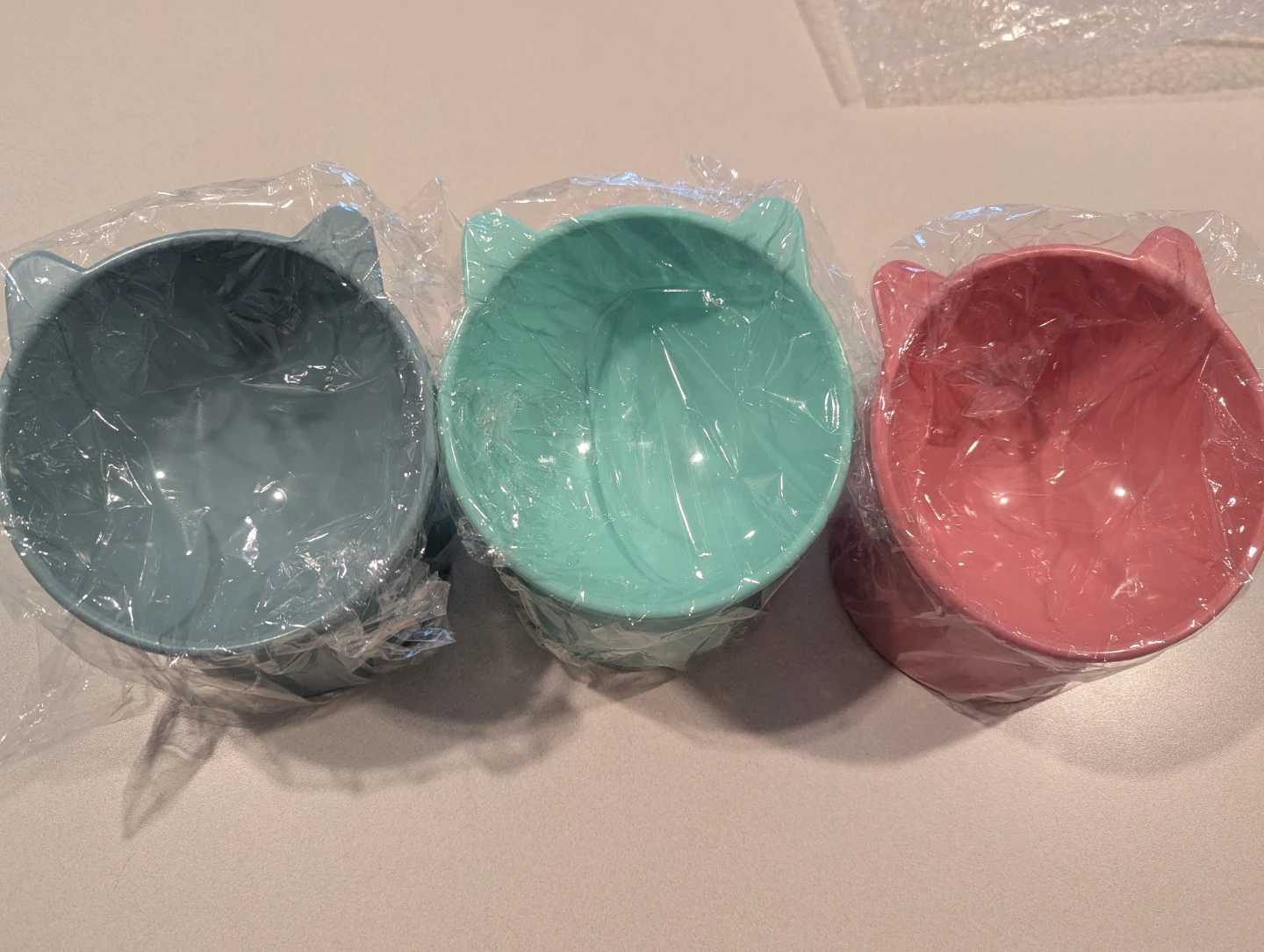 This set includes three cute cat ear-shaped plastic bowls for pets. The colours are pink, teal, and blue.