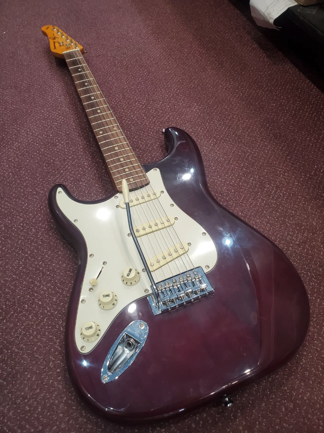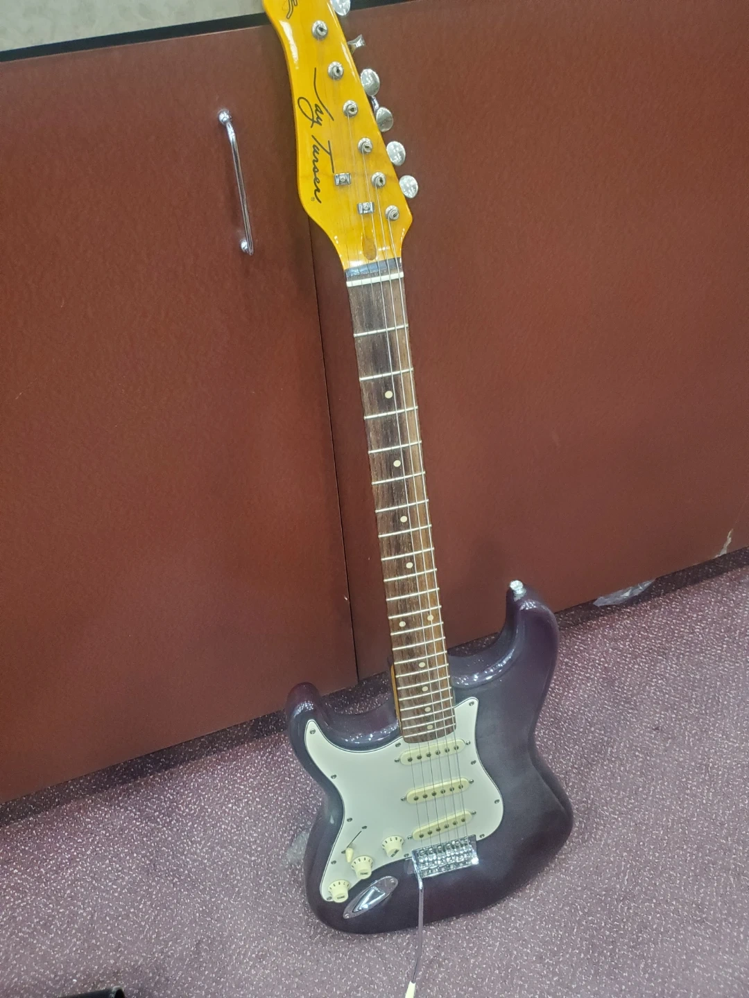 This is a left handed Jay Turser electric guitar. It's a six-string model with a dark burgandy finish and a white pickguard. It has three single-coil pickups and a tremolo bridge. This guitar is suitable for learning or casual playing.