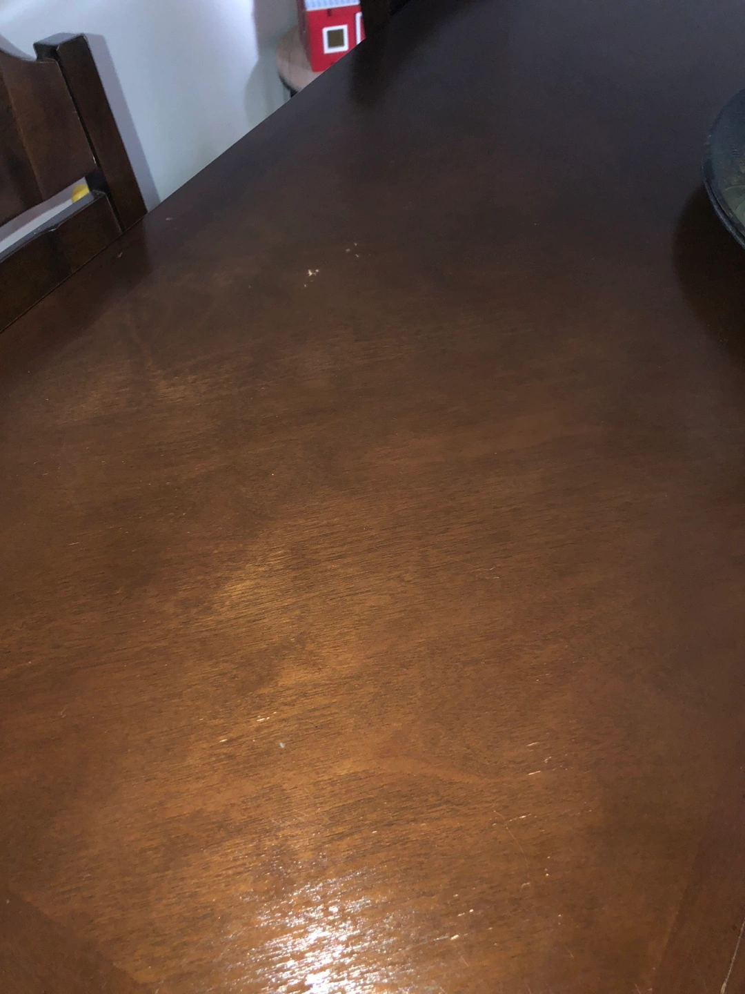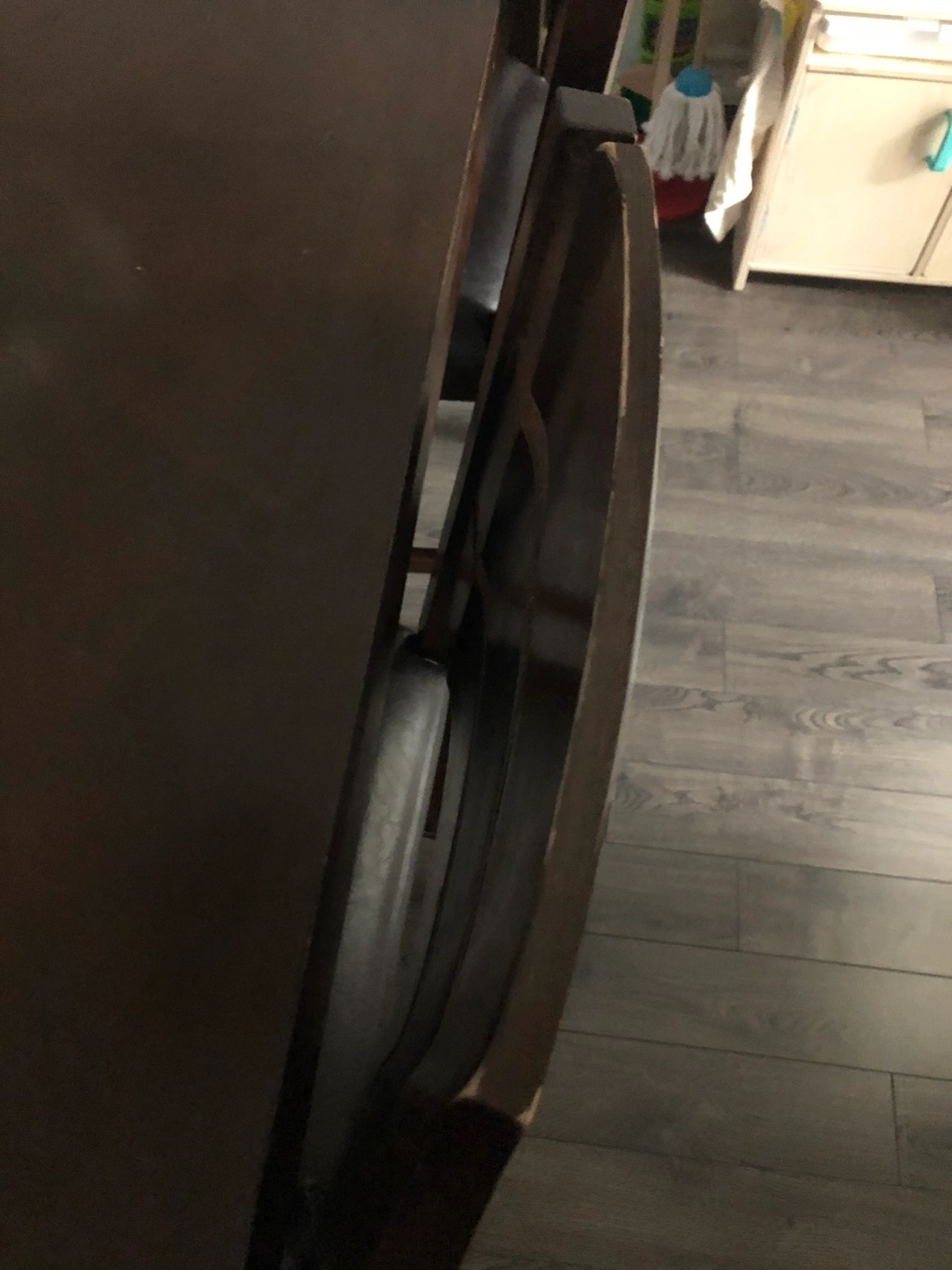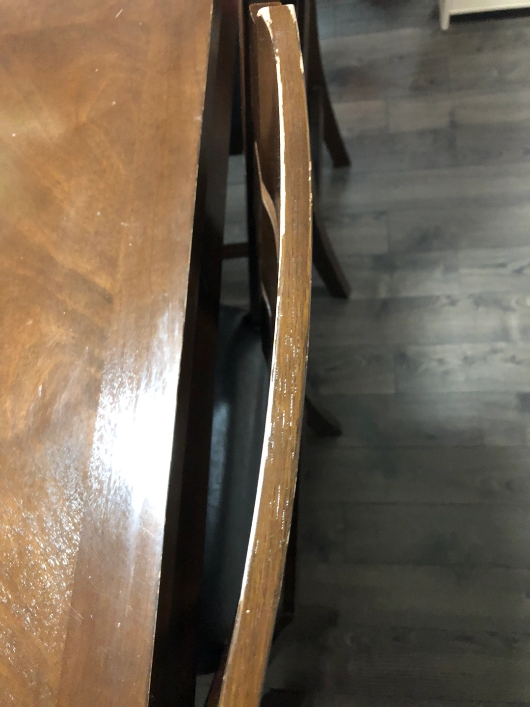 Dark brown wood extendable dining table. Can seat up to 6. Six matching leather cushioned chairs included. Some minor scratches on the table top and top of chairs. In good condition.