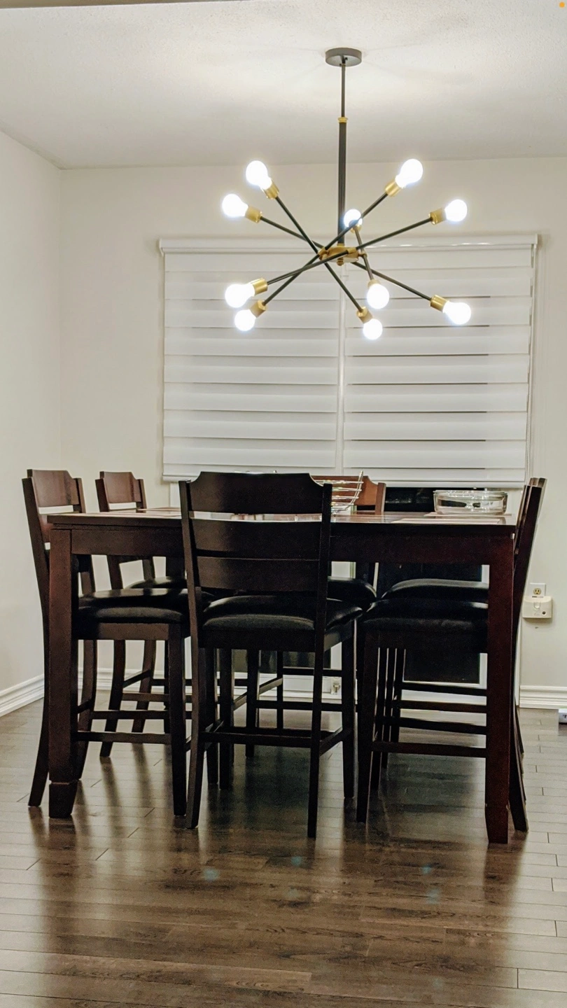 First 2 pictures is what it looks like extended with 6 chairs. Table is a high top table. Square shaped as a 6 seater and rectangle shape as a 4 seater.