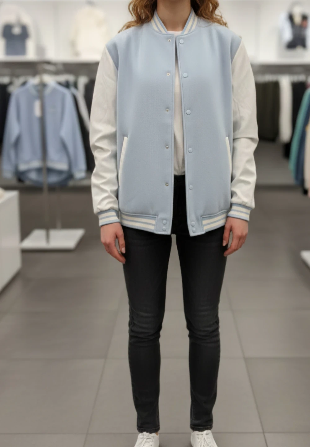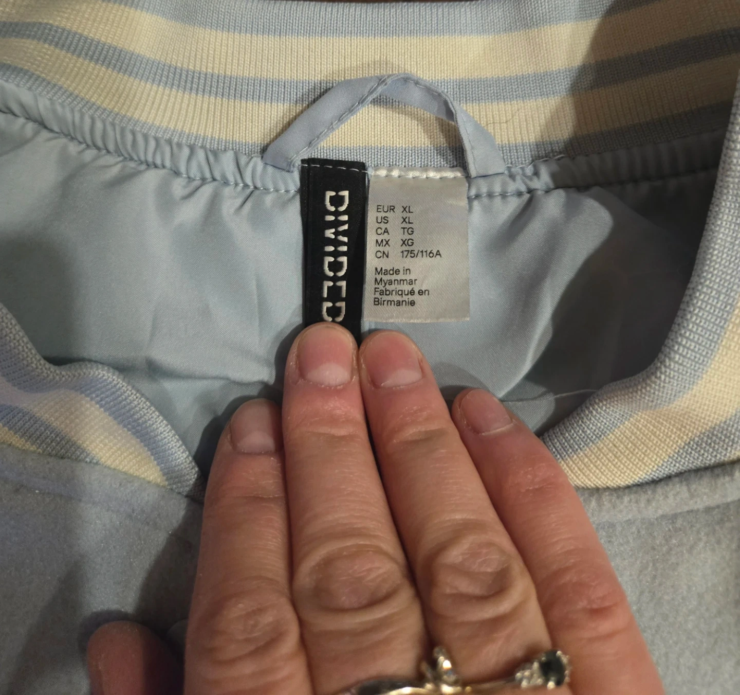 Selling a stylish H&M Divided varsity jacket in size XL! It's a light blue colour with white sleeves. Perfect for adding a cool, casual vibe to your wardrobe