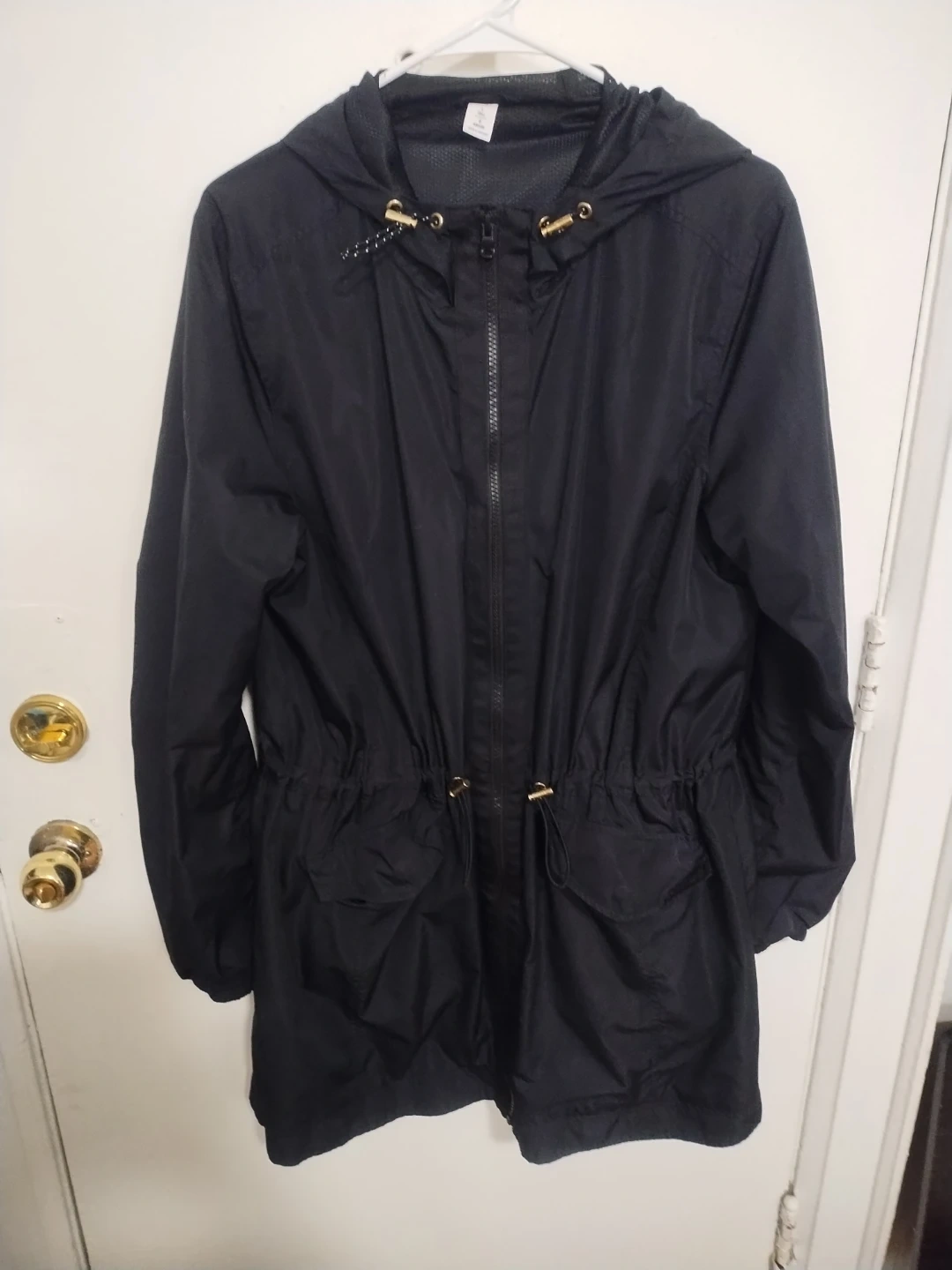 This black hooded jacket is lightweight and perfect for layering. It features a drawstring waist for a custom fit and two front pockets. It's made from a water-resistant material, great for unpredictable weather!