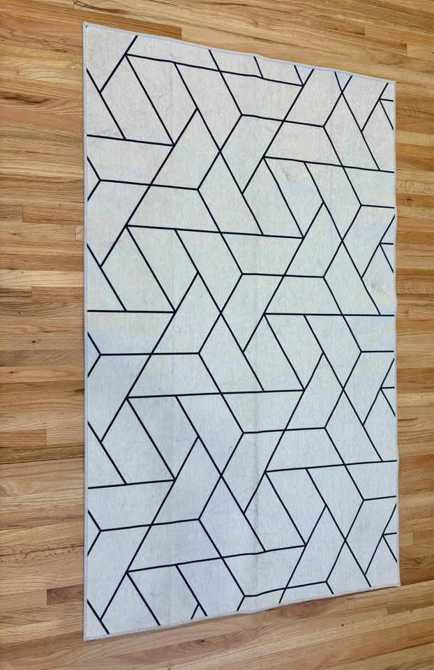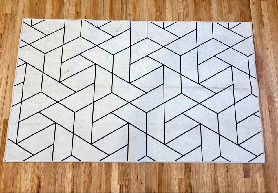 103Rug-All Washable 5ftx3ft Geometric Area Rug White w/ Blue Freshly washed and vacuumed Pick up in Altadore / Marda Loop SW Cash only please Pet & Smoke Free Home