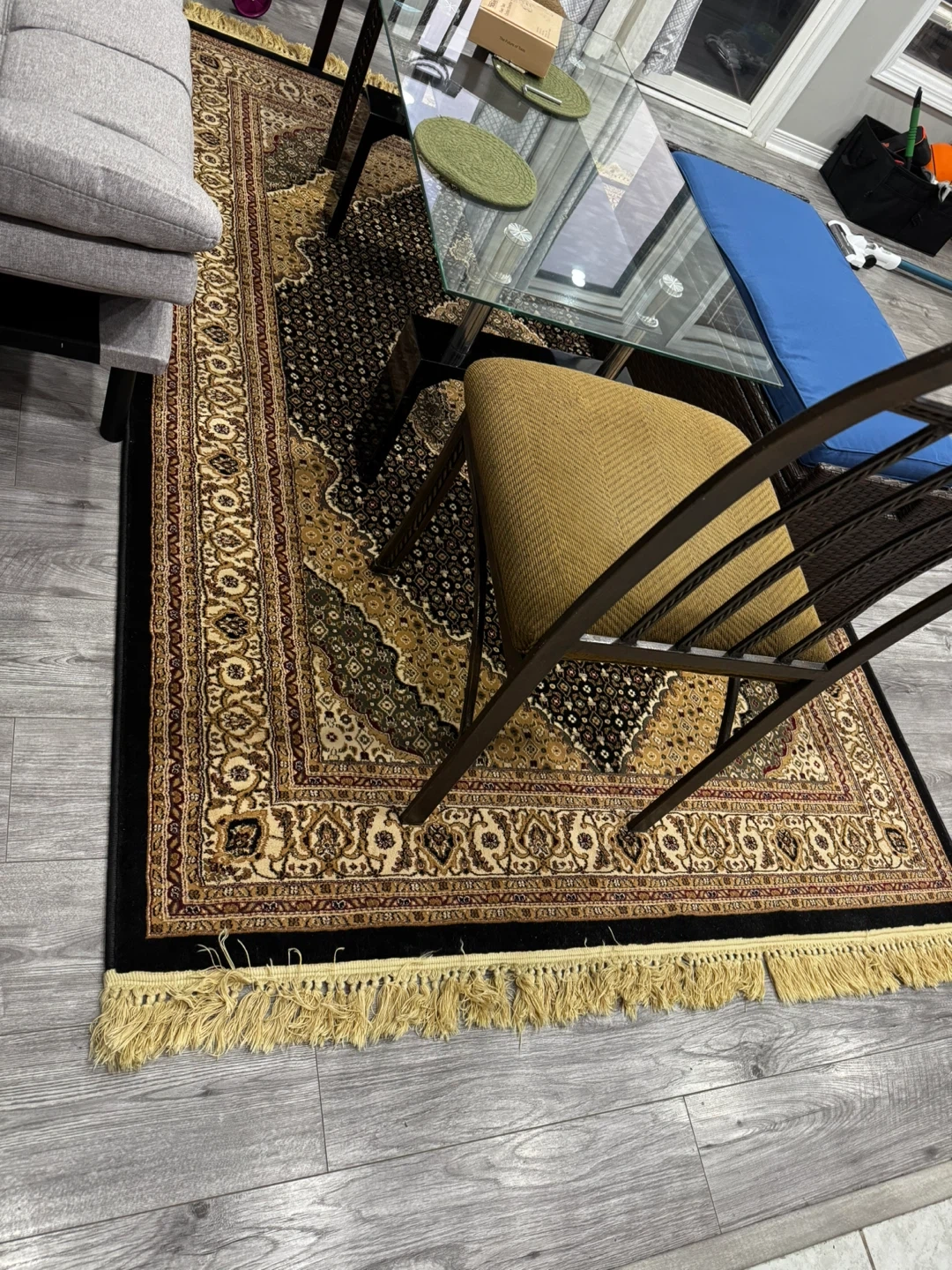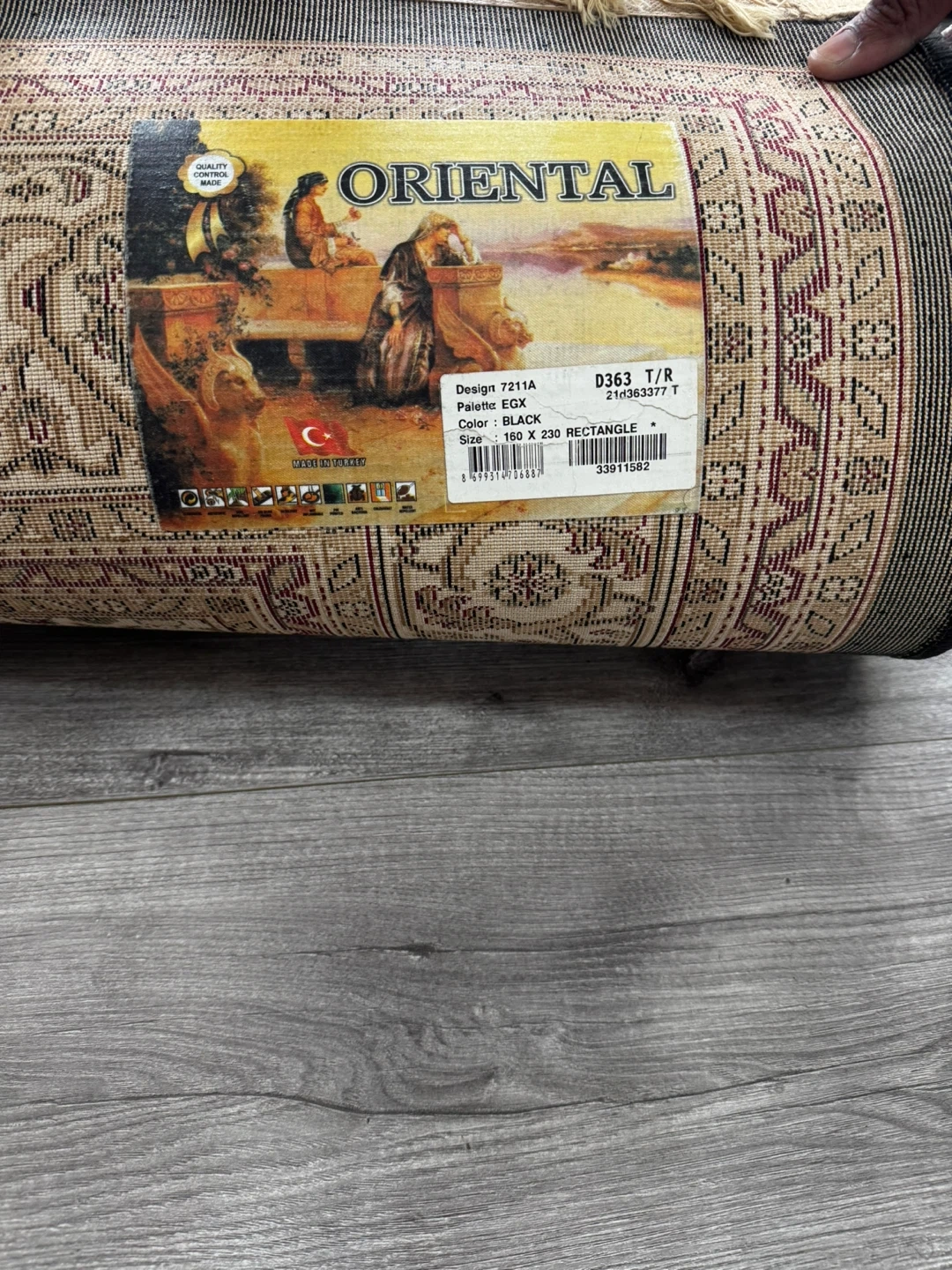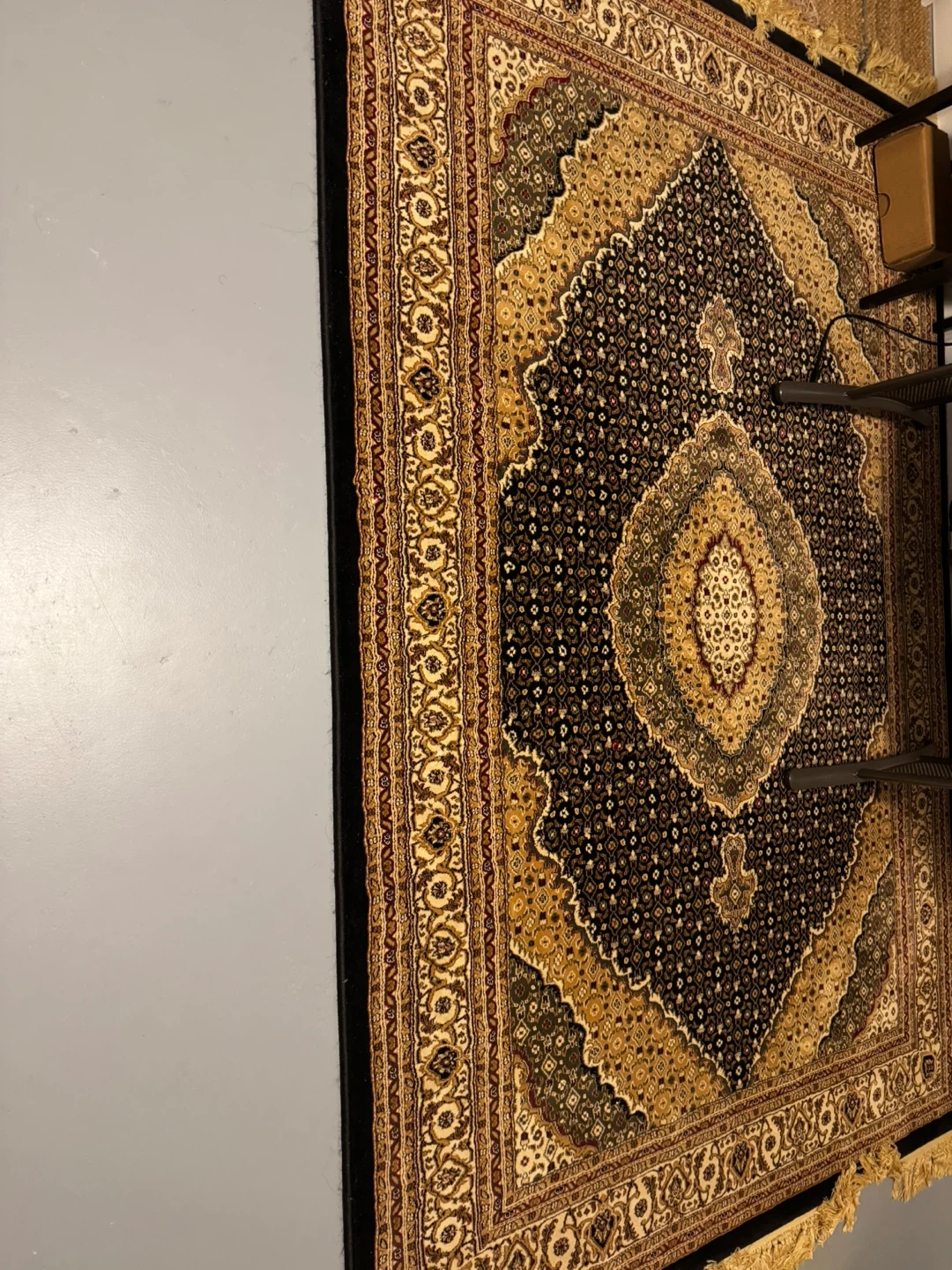 Selling an Oriental rug in black. It's a rectangle shape and would look great in any room of the house!