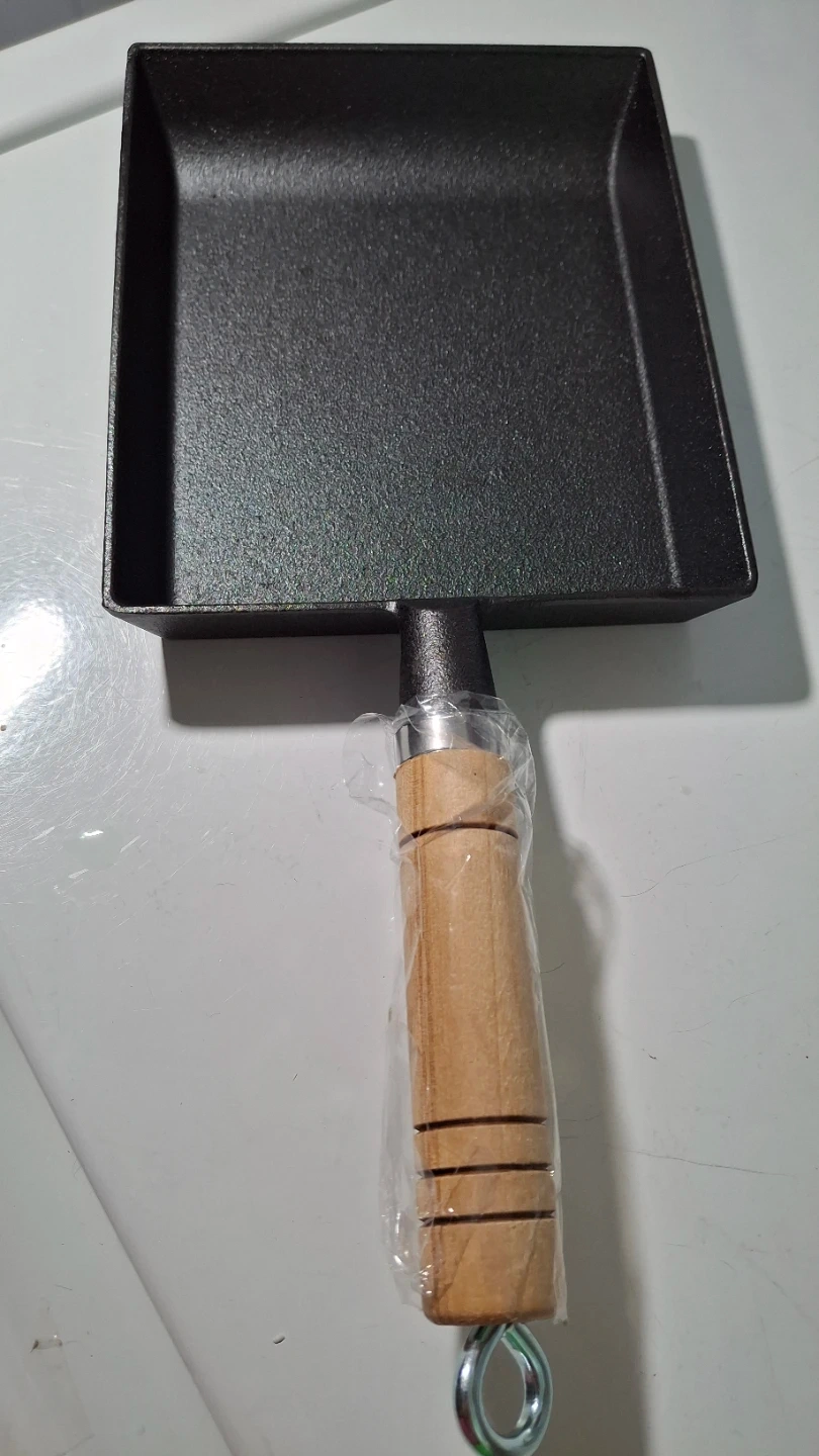 This is a square tamagoyaki pan made from cast iron. It has a wooden handle for easy grip. Perfect for making Japanese rolled omelettes!