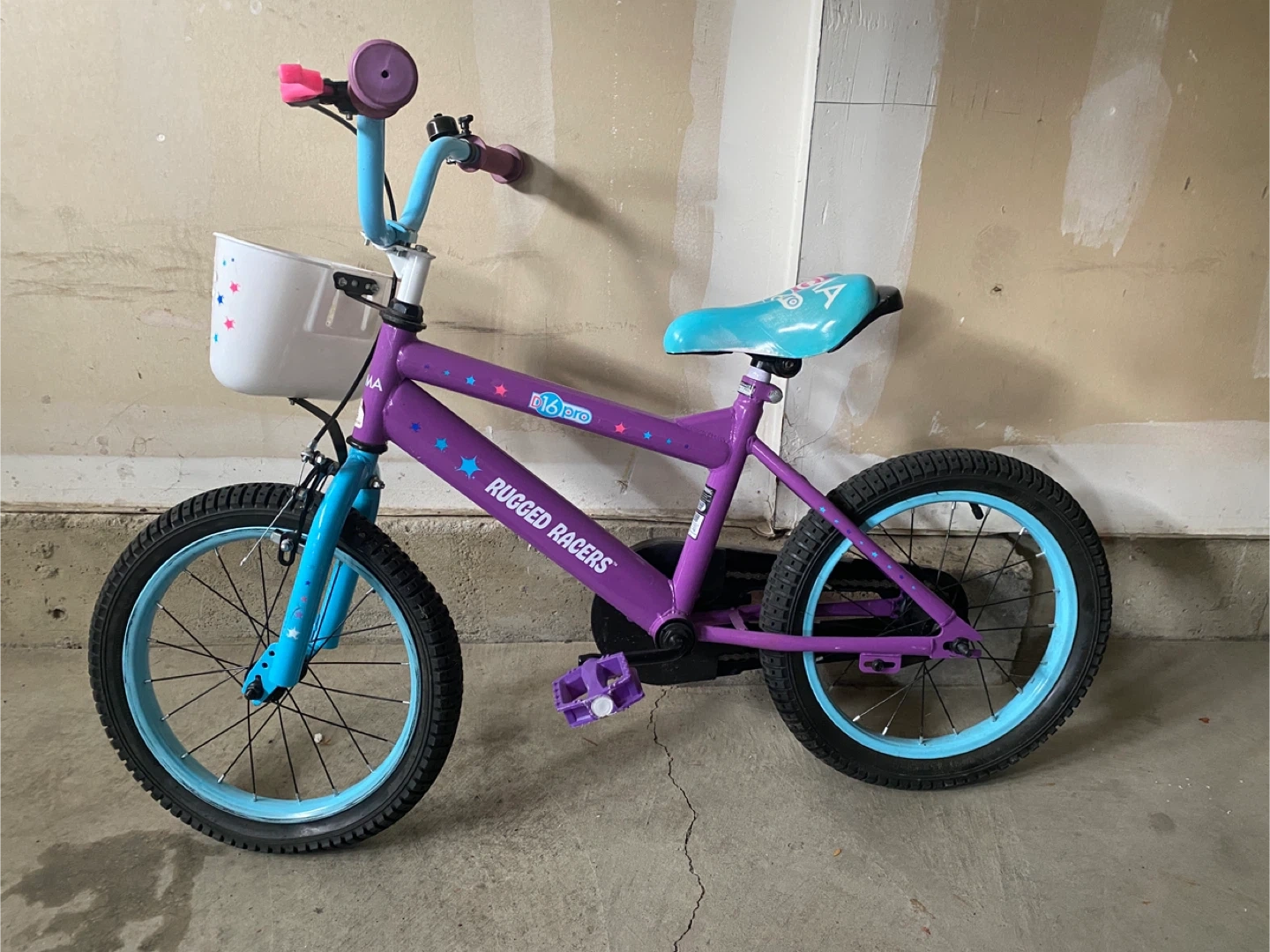 65Selling a Rugged Racers 16 Pro kids bike in purple and blue! “Flat front tire”. This bike features a sturdy frame and is perfect for learning to ride. It also comes with a cute basket!