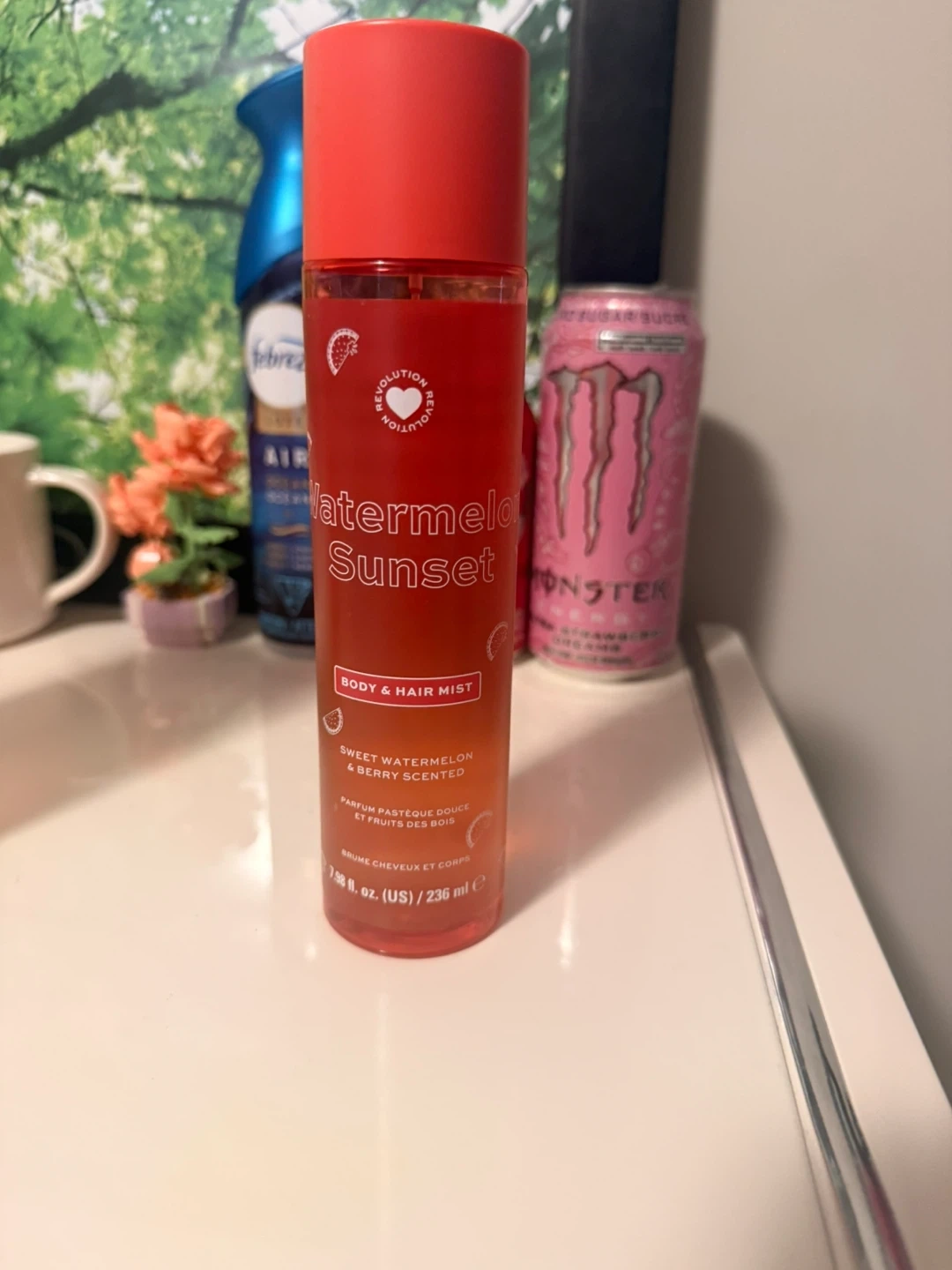 Three Revolution Body & Hair Mists available: Watermelon Sunset (sweet watermelon & berry scented), Tropical Caramel (tropical caramel scented), and Peach Fizz (fresh peach & citrus scented). Each bottle contains 7.95 fl. oz. (US) / 236 ml. It's a great way to add a pleasant scent to your hair and body!