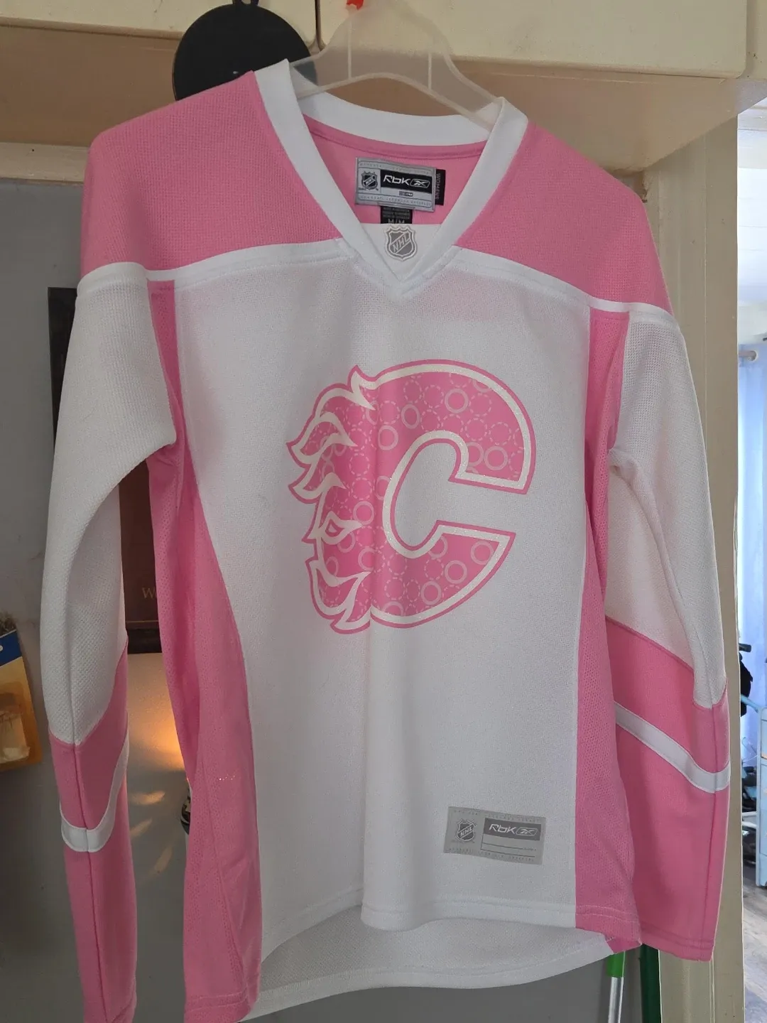 Reebok Calgary Flames women's hockey jersey. It's white with pink accents and features the Flames logo on the front. Size is medium.
