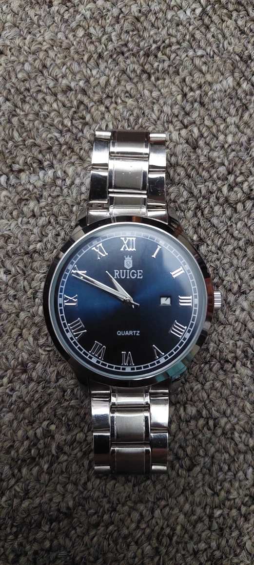 15Selling a RUIGE Quartz watch. It's in great condition and features a classic design with Roman numerals on a blue face. The band is silver-toned.