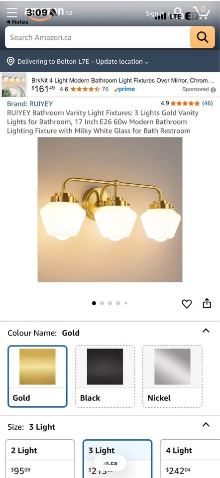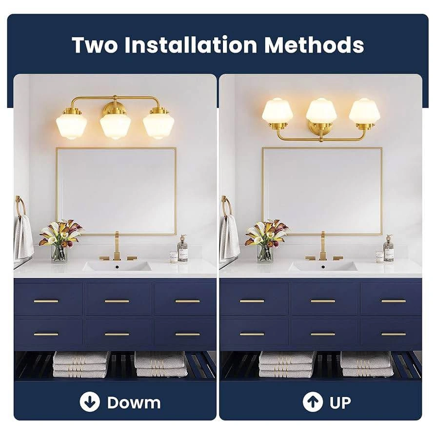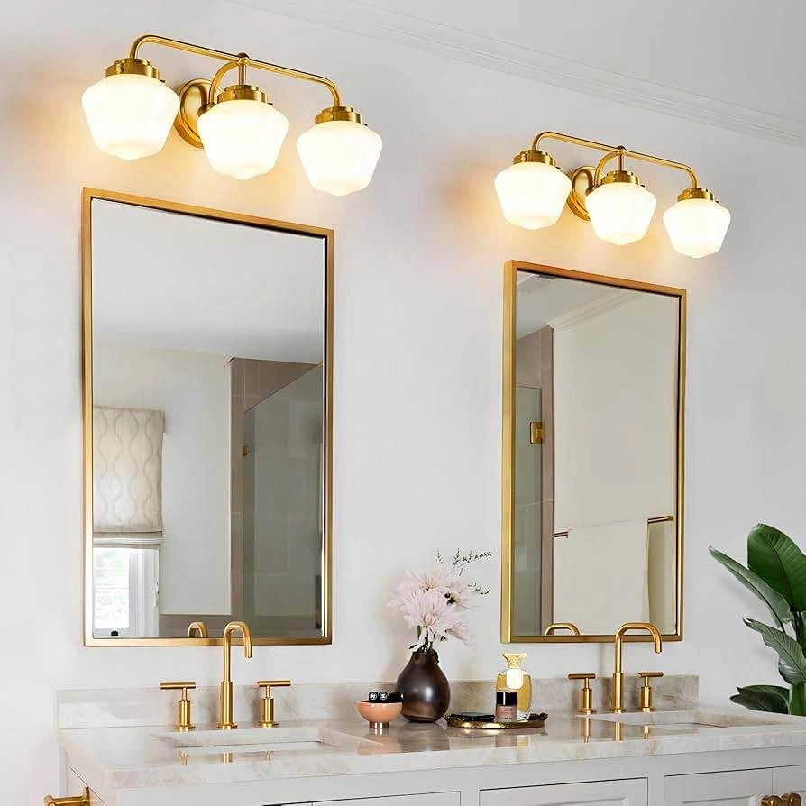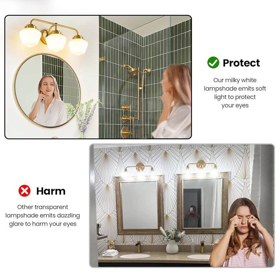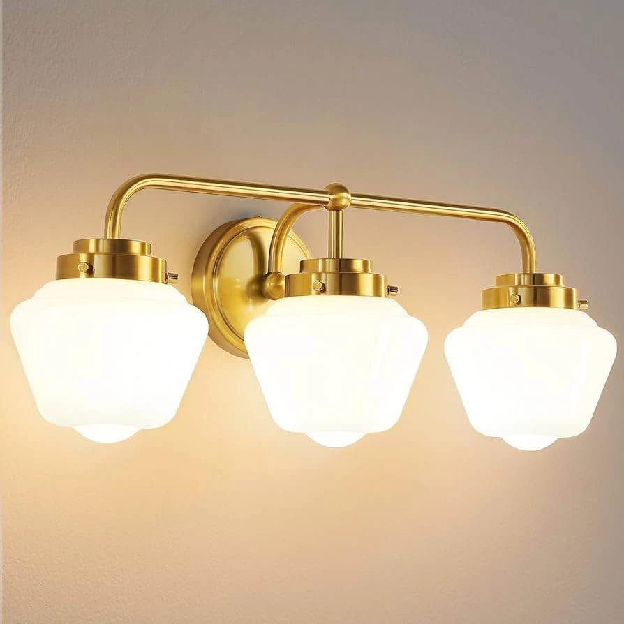 Selling a RUIYEY bathroom vanity light fixture with three lights. It's a gold vanity light for the bathroom, measuring 17 inches. Features an E26 60W modern bathroom lighting fixture with milky white glass for bath restroom