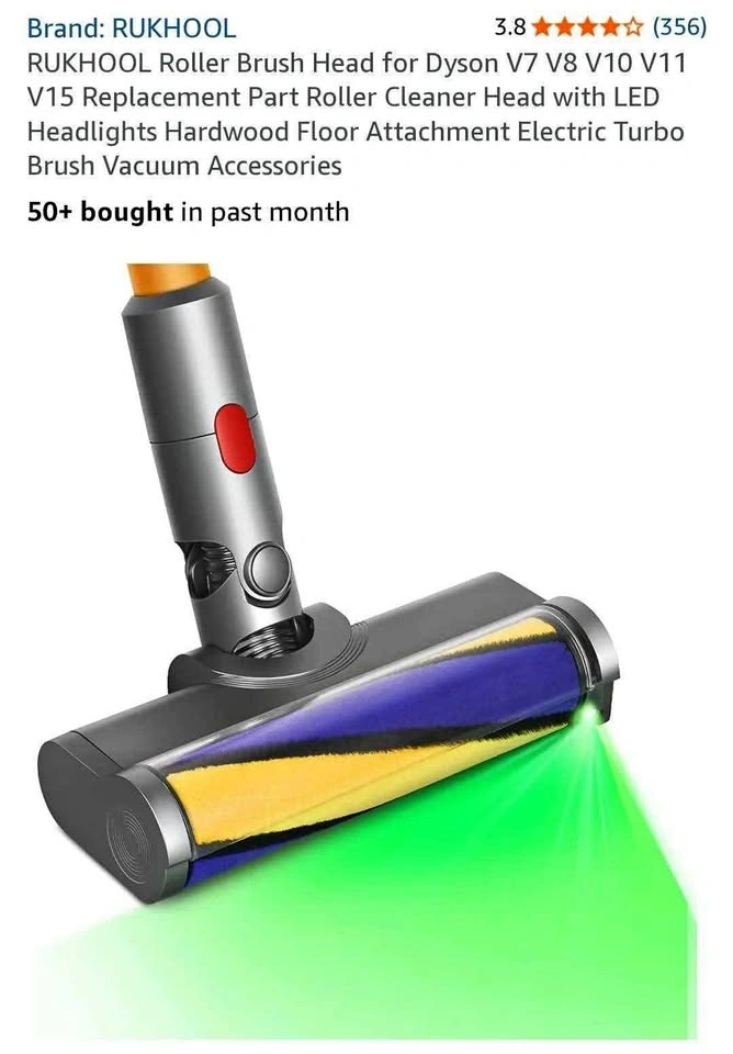 RUKHOOL roller brush head, designed for Dyson V7, V8, V10, V11, and V15 vacuum cleaners. This replacement part features an electric turbo brush with LED headlights, perfect for carpets and hardwood floors. It is in new condition, never been used. Here are some of its notable features: * Compatibility: Dyson V7, V8, V10, V11, V15 * Type: Roller Brush Head * Features: LED Headlights, Electric Turbo Brush