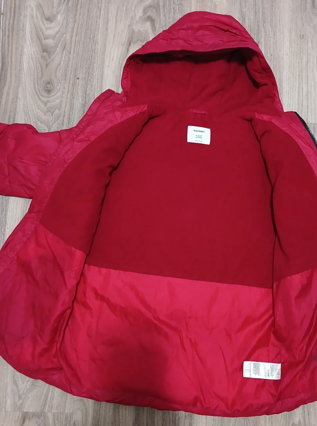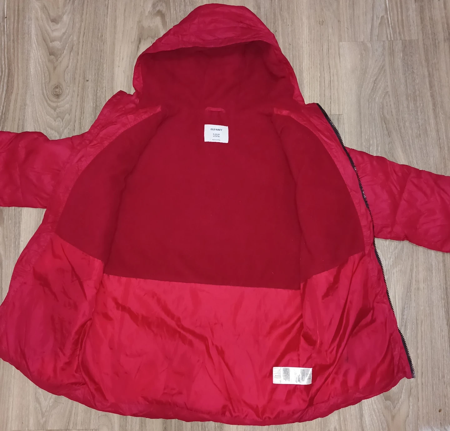 Selling a bright red puffer jacket! It has a hood and a zipper closure. Perfect for staying warm during the colder months. It's in great condition and ready for a new home.