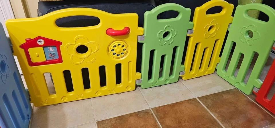 Great condition baby playpen with 16 panels, comes in its original box. Perfect for placing a play mat inside for your baby to enjoy in a safe area. Includes a gate for easy entry and exit.