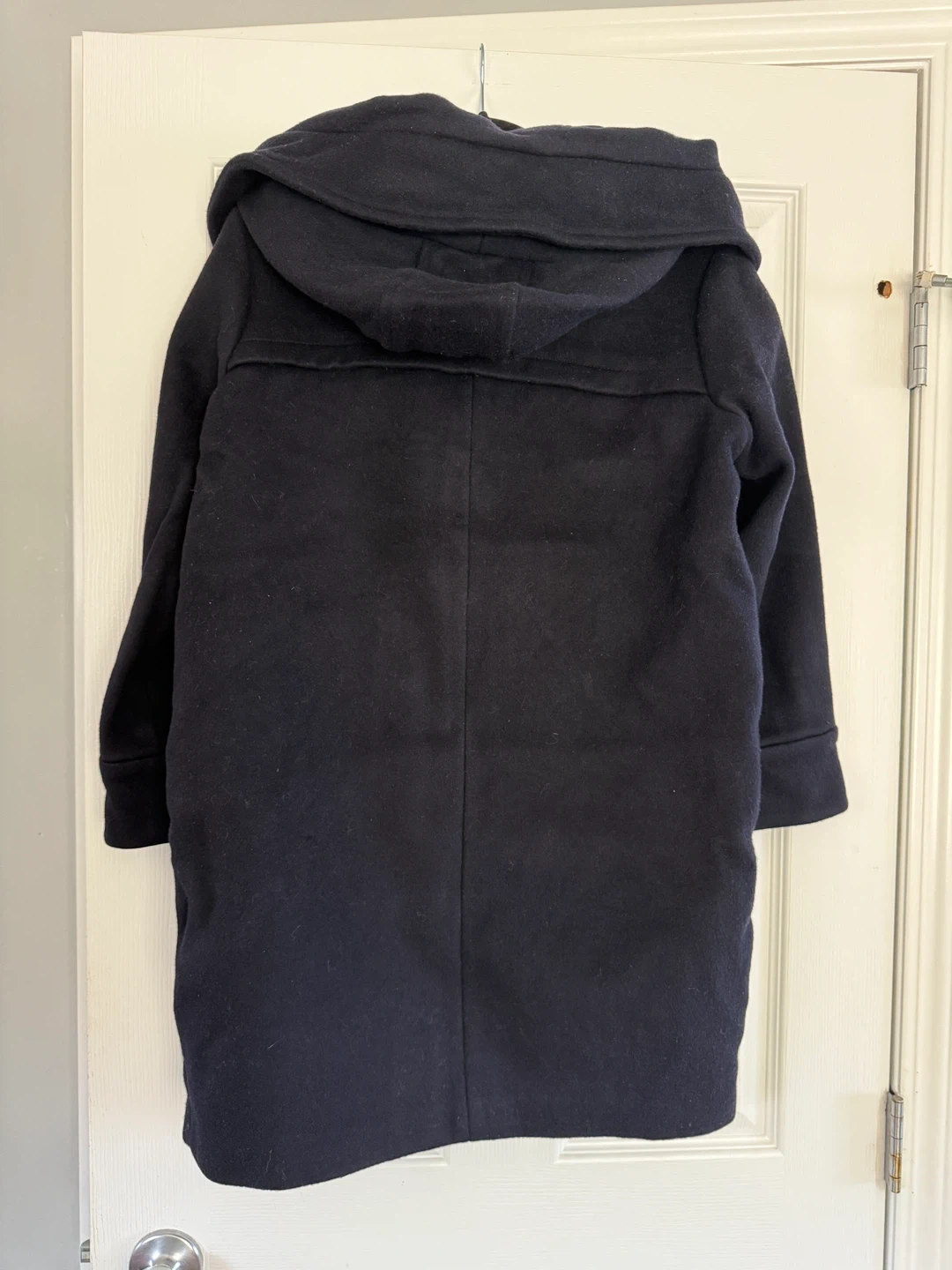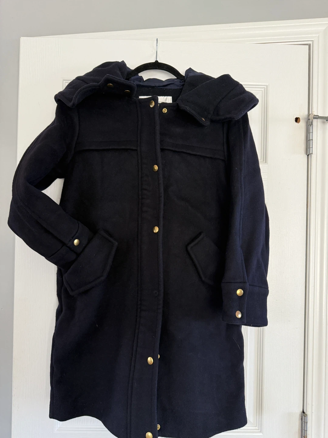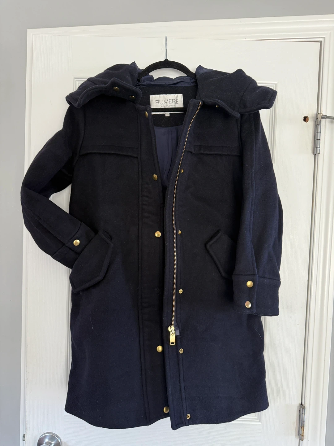 25Here's a stylish navy blue duffle coat from RUMERE. It's made of wool and features a hood and gold-tone button details. Perfect for staying warm and looking great!