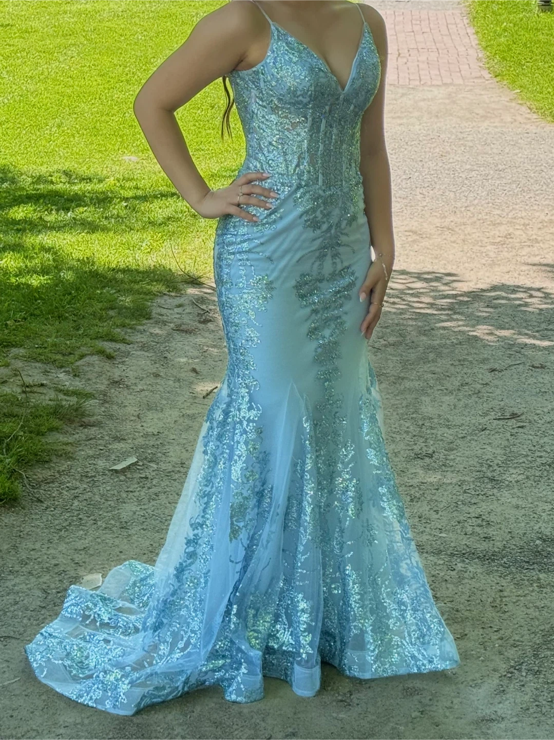 Beautiful light blue mermaid-style prom dress with all-over sparkle and intricate floral embroidery. It features a V-neckline and a fitted bodice that flows into a dramatic flared hem. Perfect for formal events!