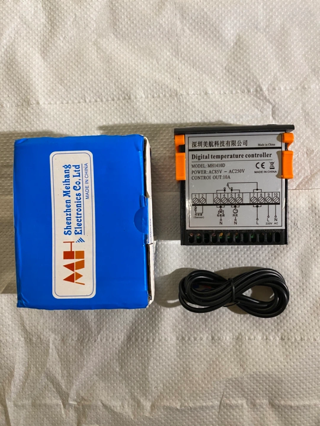 This is a digital temperature controller, model MH1410D. It runs on AC85V - AC250V power and has a control output of 10A. It's suitable for applications requiring precise temperature management.