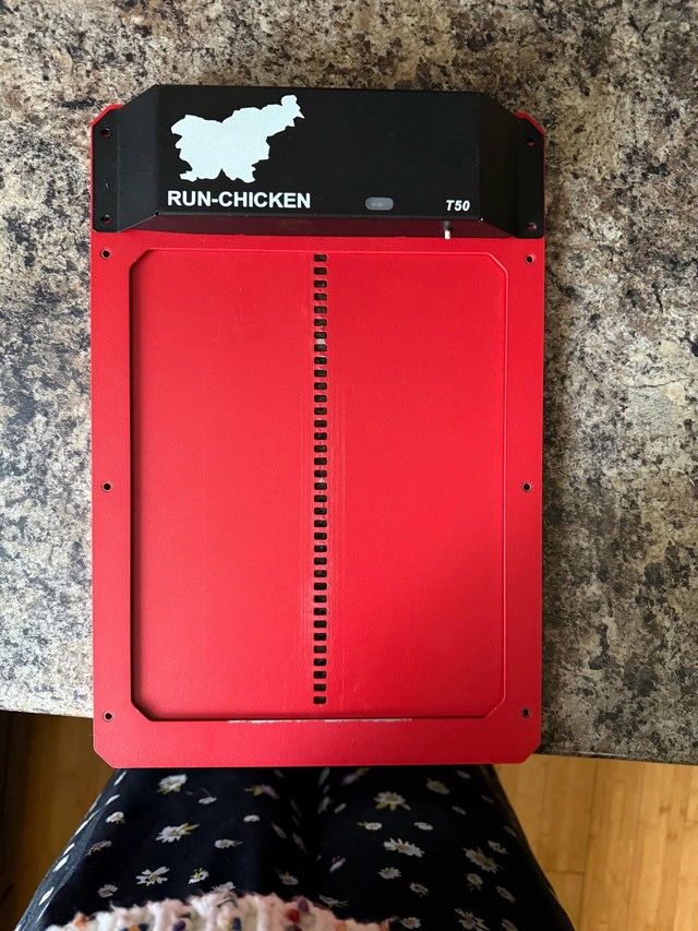 15I'm selling a Run-Chicken T50 automatic chicken coop door, featuring a programmable light sensor and timer for reliable operation. This door is constructed from durable aluminum and is battery powered, ensuring your chickens are secure day and night. It is used, but in good working condition. Key features include: * Automatic operation with light sensor and timer * Durable aluminum construction * Battery powered for easy installation * Model: T50 Pick up in Lynnwood If the ad is up, it's available!