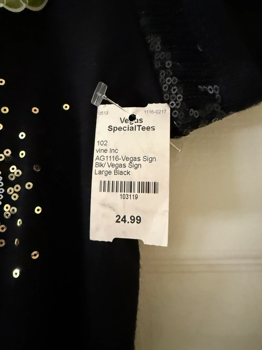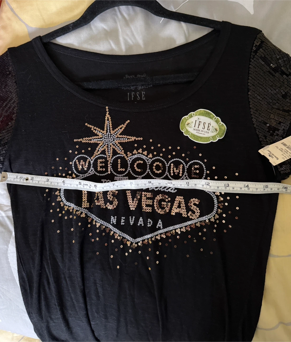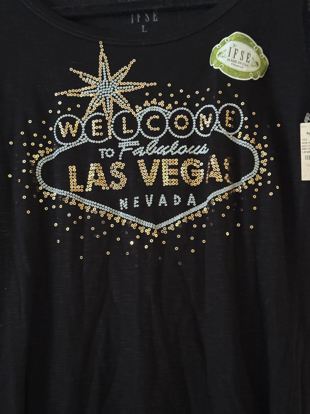 This black IFSE t-shirt features a "Welcome to Fabulous Las Vegas, Nevada" graphic made with sequins and beading. It has sequined short sleeves and is a size large. Made in the USA.