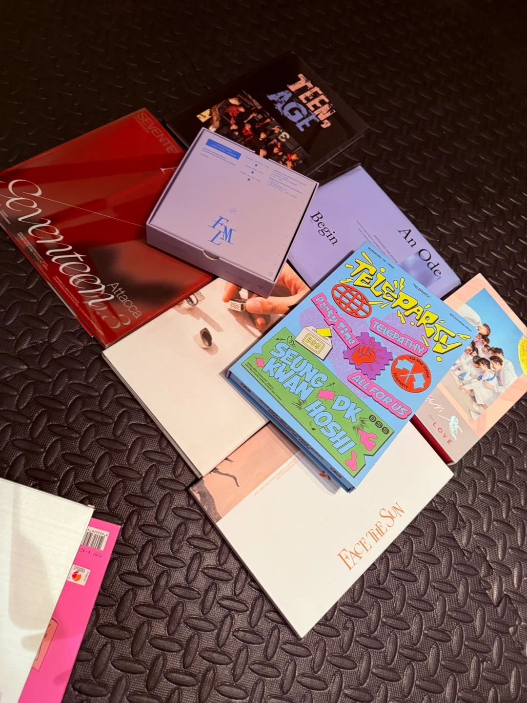 Collection of SEVENTEEN K-pop albums and photobooks including 'Face the Sun', 'An Ode', 'Teen, Age', and more. These are official releases from the group.