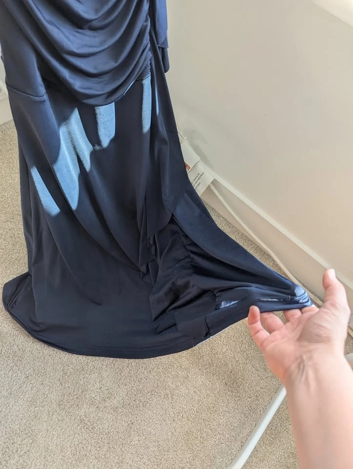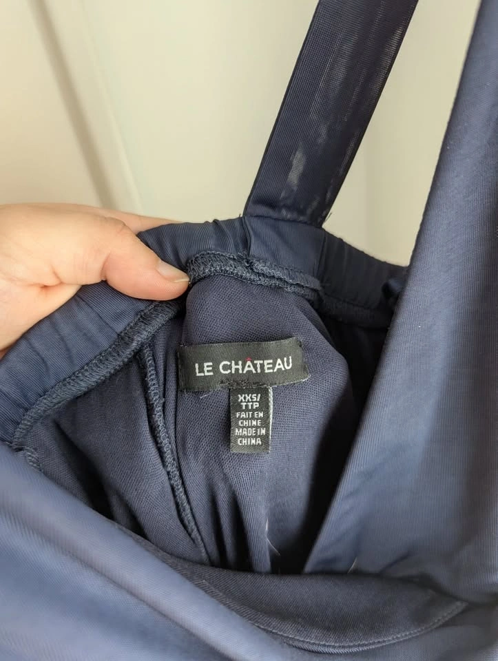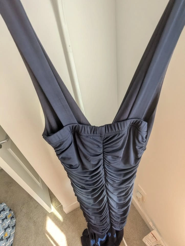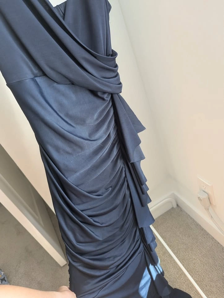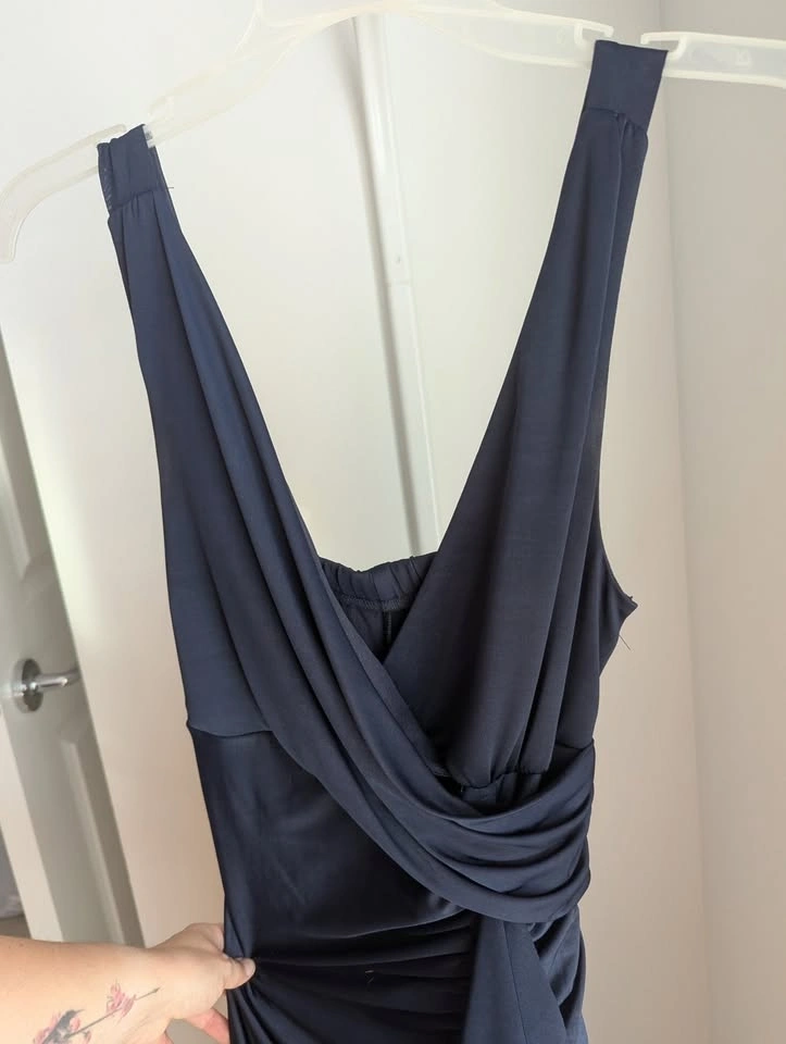 My old prom dress! Only worn twice, so like new! The dress is Navy and was hemmed to floor length for me with heels on (I'm 5'4"). Nice V neck that doesn't plunge too low, and a ruffle from below the bust to the floor. Very flattering without showing too much skin! Size XXS but quite a bit of stretch to it, I think you could fit small but not medium. Asking $40 pickup near Langley Costco.
