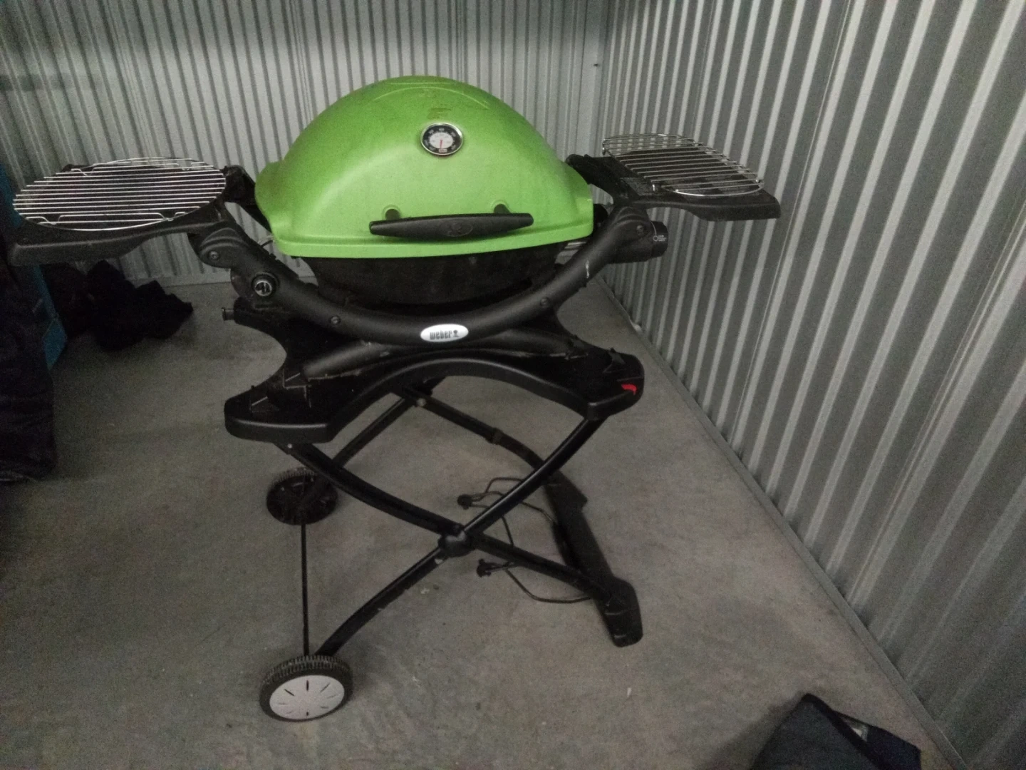Green Weber Q1200 portable propane grill. It's designed for easy setup and use. This grill is great for camping trips or small patios!