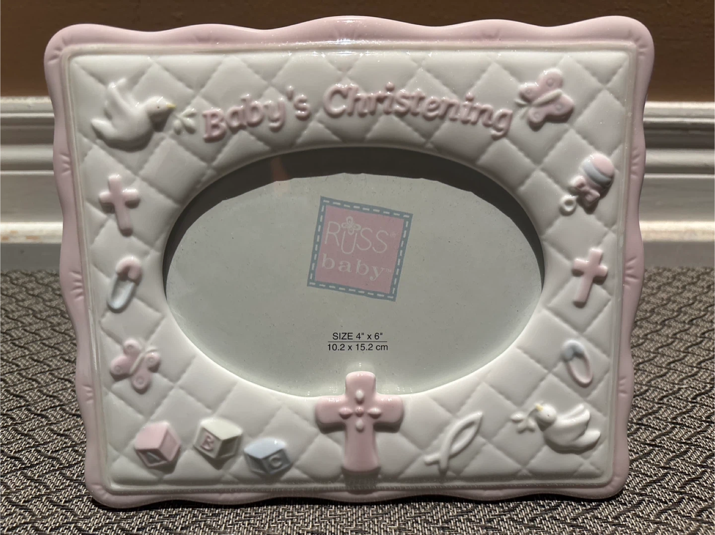 57This is a sweet Russ Baby photo frame perfect for a baby's christening! It's designed for a 4" x 6" photo and features adorable details like a quilted pattern, crosses, doves, and baby blocks