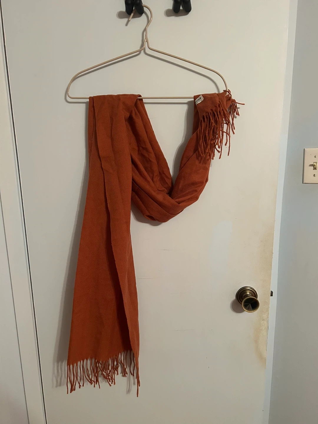 472Here's a lovely pashmina scarf in a deep orange or rust colour. It's a beautiful warm colour and would be perfect for adding a touch of elegance to any outfit.