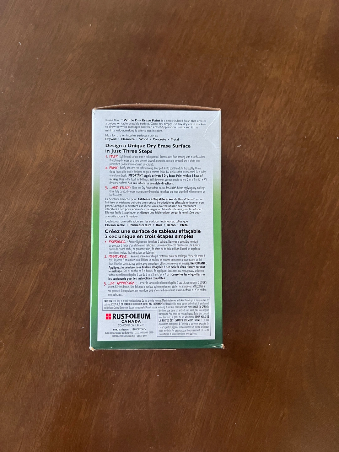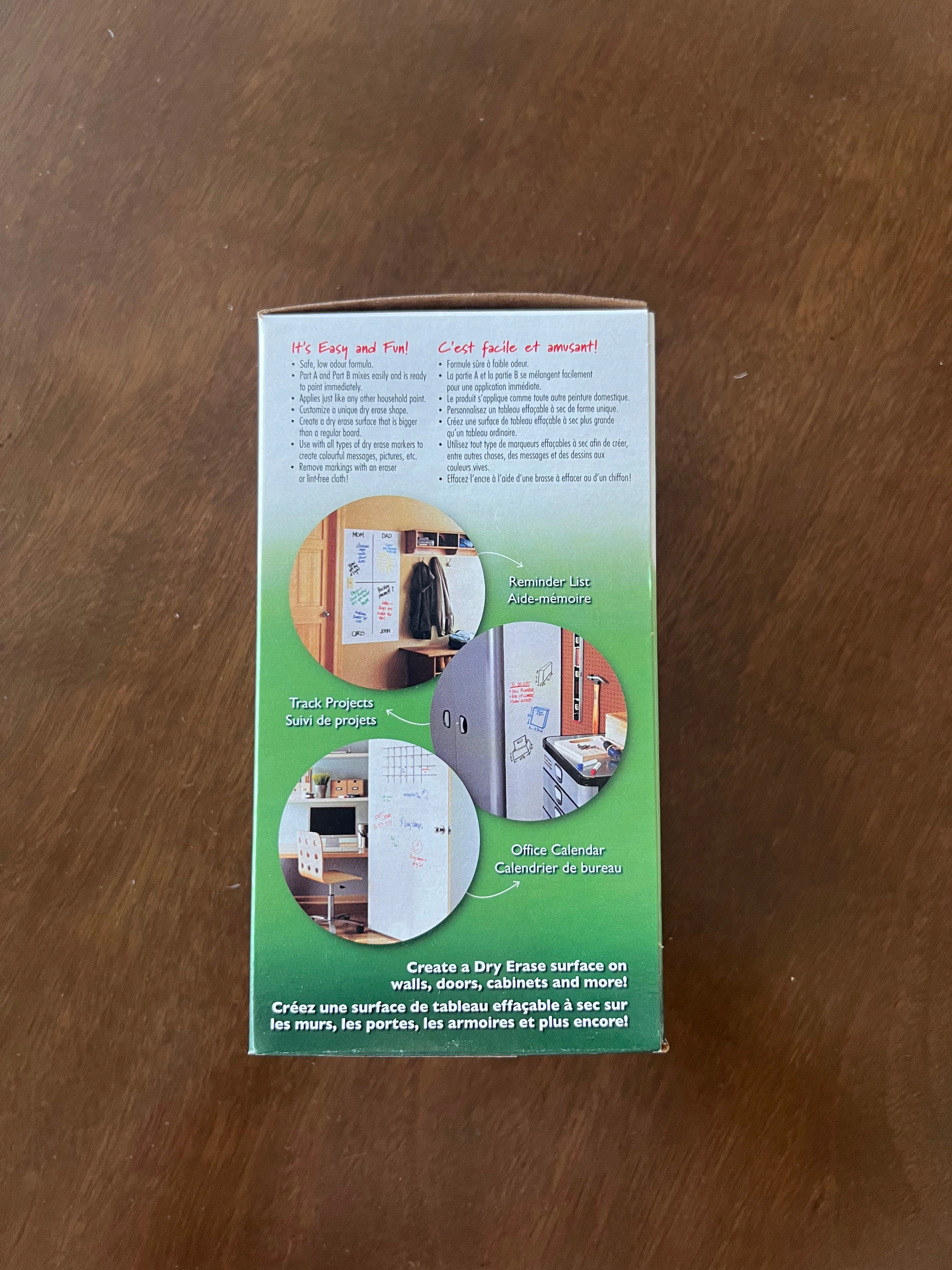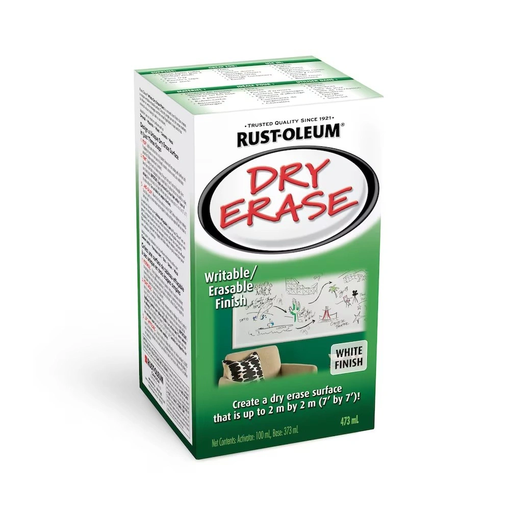 89Rust-Oleum® Dry Erase Paint is a smooth, hard finish that creates a unique white writeable-erasable surface. Once dry, simply use any dry erase markers to draw or write messages and then erase! Application is easy and it has minimal odour making it safe to use indoors. Ideal for use on interior surfaces such as drywall, masonite, wood, cement, metal. - Great for offices, playrooms, kids rooms and more - Part A and Part B mixes easily and is ready to paint immediately. - Apply to a smooth surface and allow to dry 2 days before applying dry erase markings.