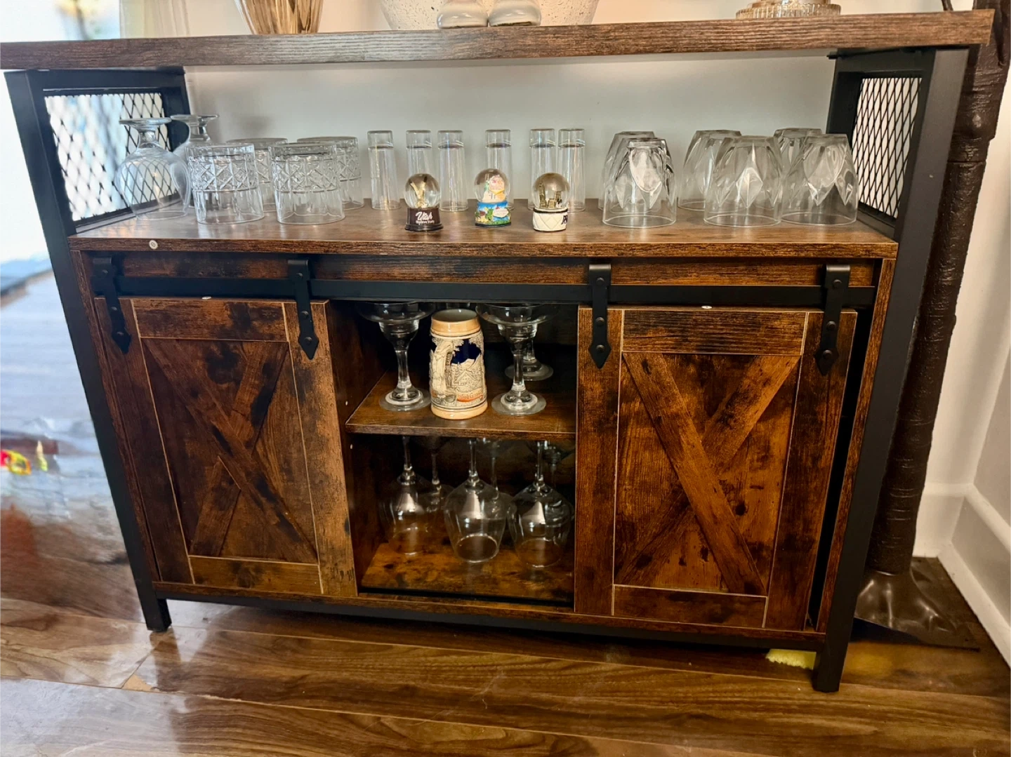 30This rustic brown bar cabinet is perfect for adding a touch of farmhouse charm to your home. It features sliding barn doors, providing easy access to your glassware and bar accessories. The cabinet offers ample storage space, with shelves and compartments to keep everything organized. It's in great condition and ready to elevate your entertaining space! The glasses can be taken along with the unit if you’d like