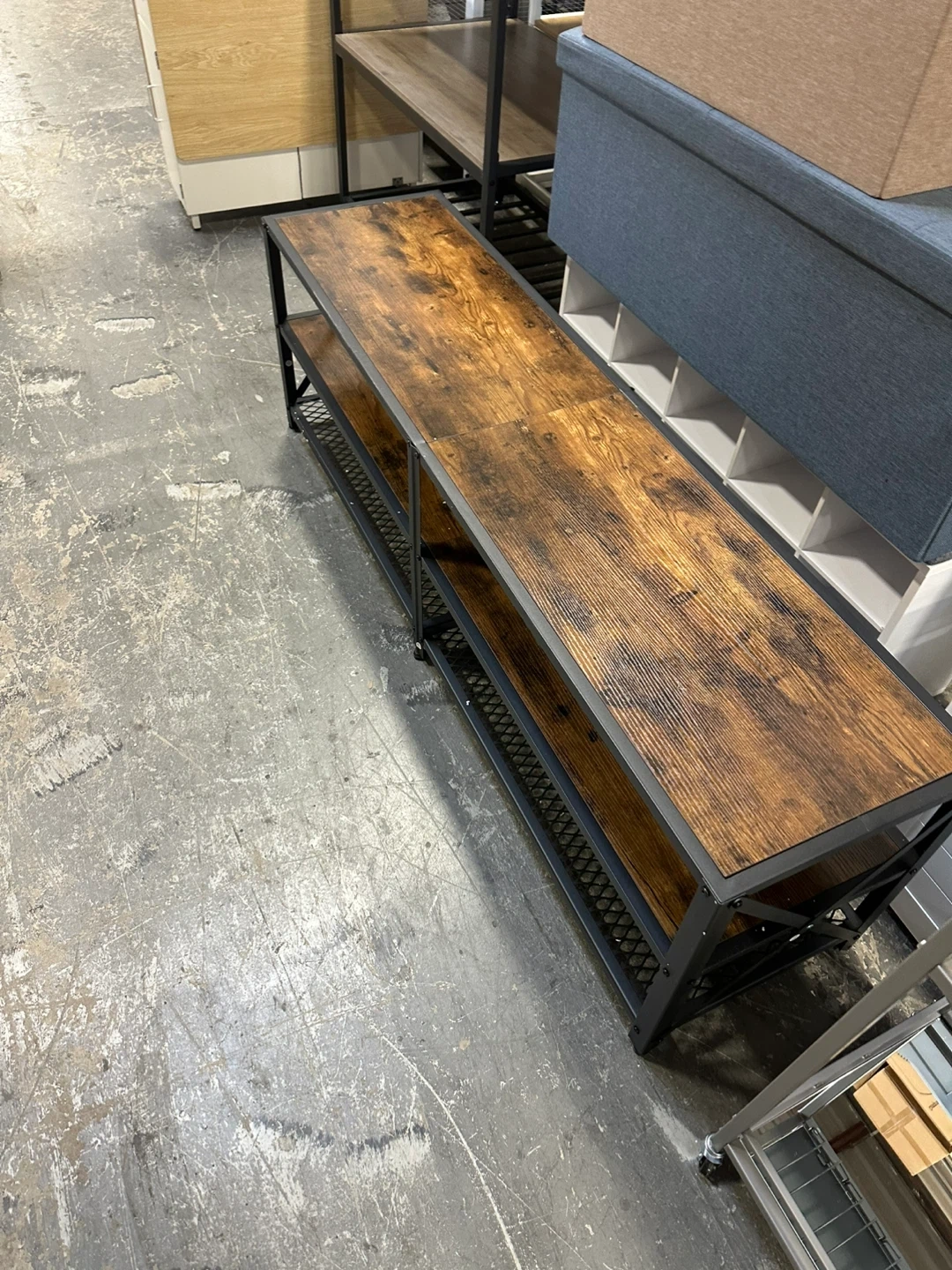 Looking to sell this rustic brown TV stand with a black metal frame! It has a cool industrial look and would be great for any living room. It's in good condition and has two shelves for storage