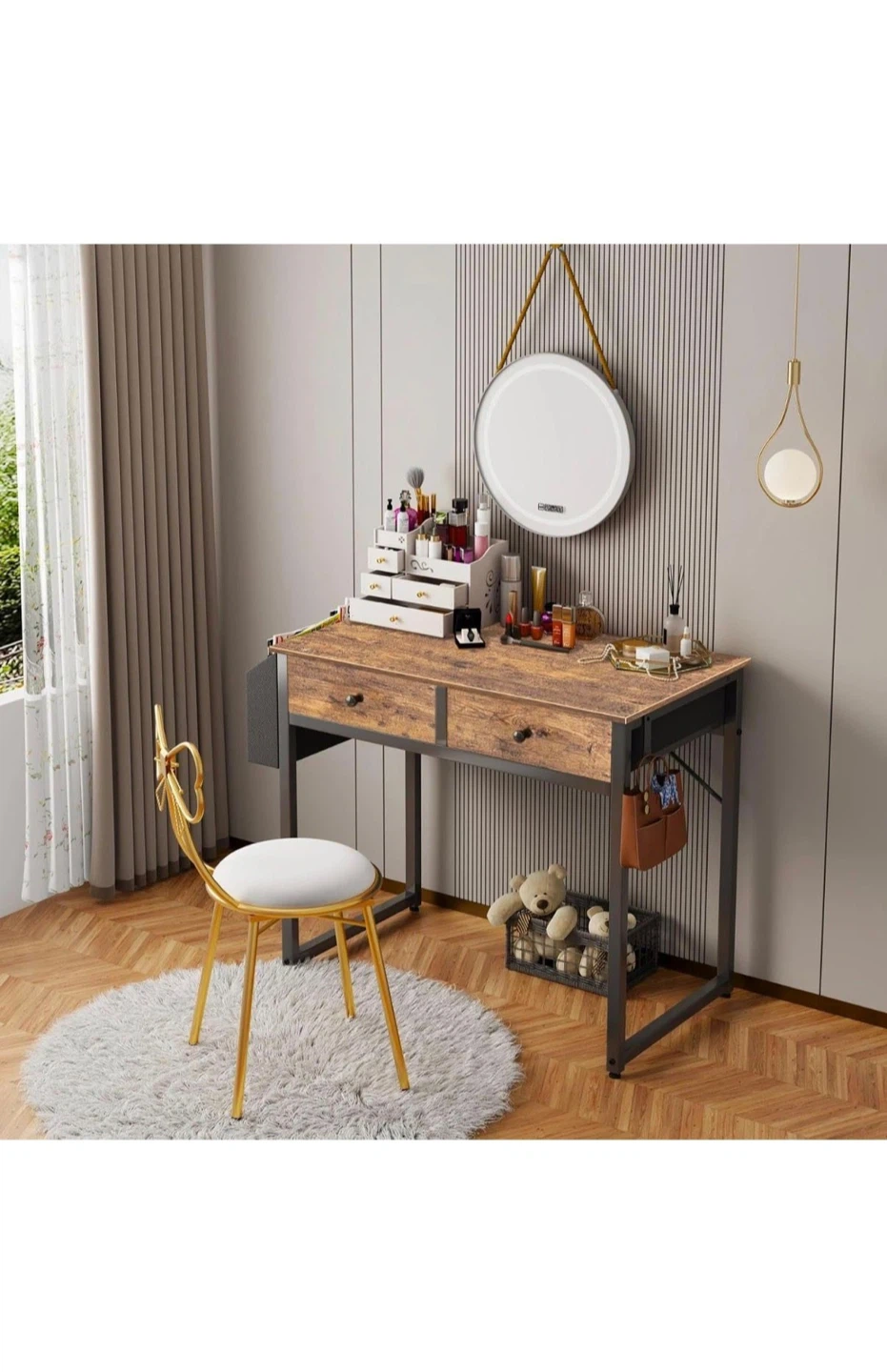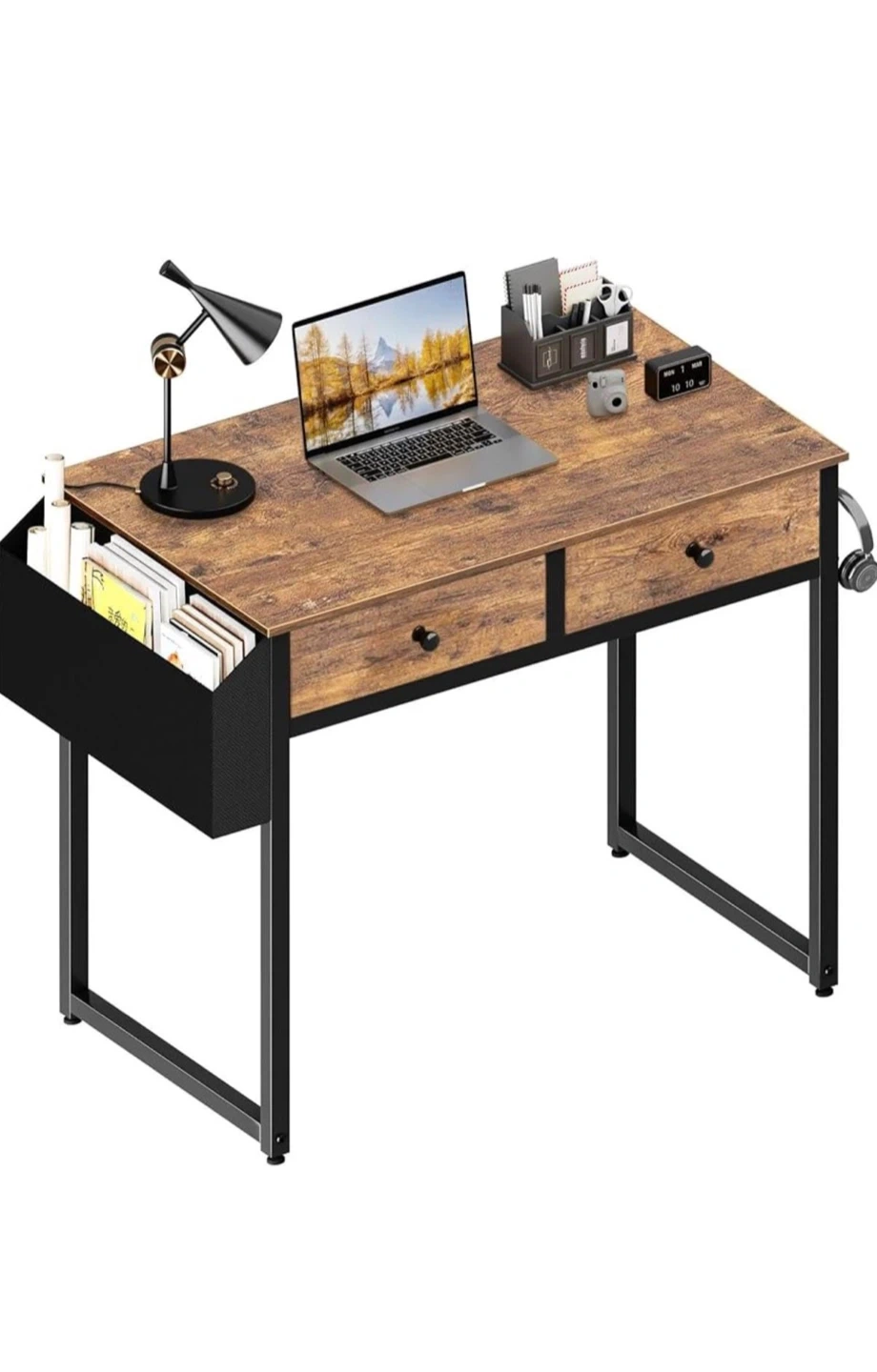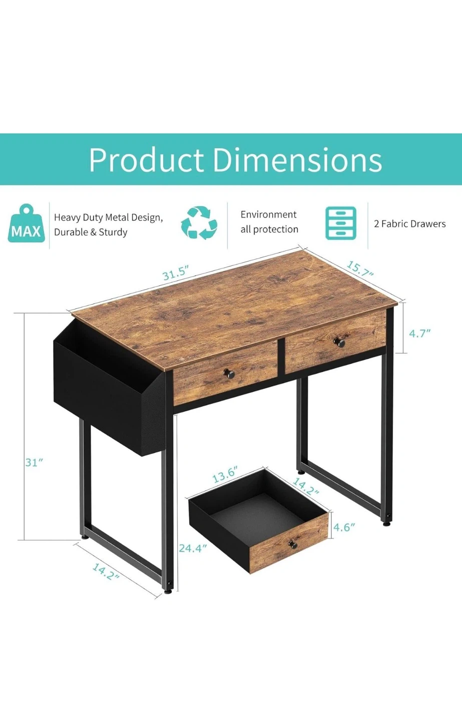 Looking to sell this rustic brown computer desk! It features a heavy-duty metal design and two fabric drawers. The dimensions are: - 31.5" wide - 15.7" deep - 31" high It's durable, sturdy, and in great condition!