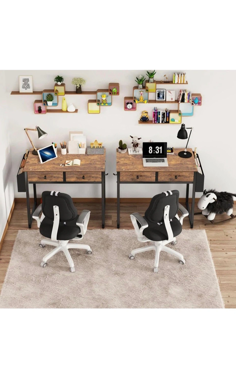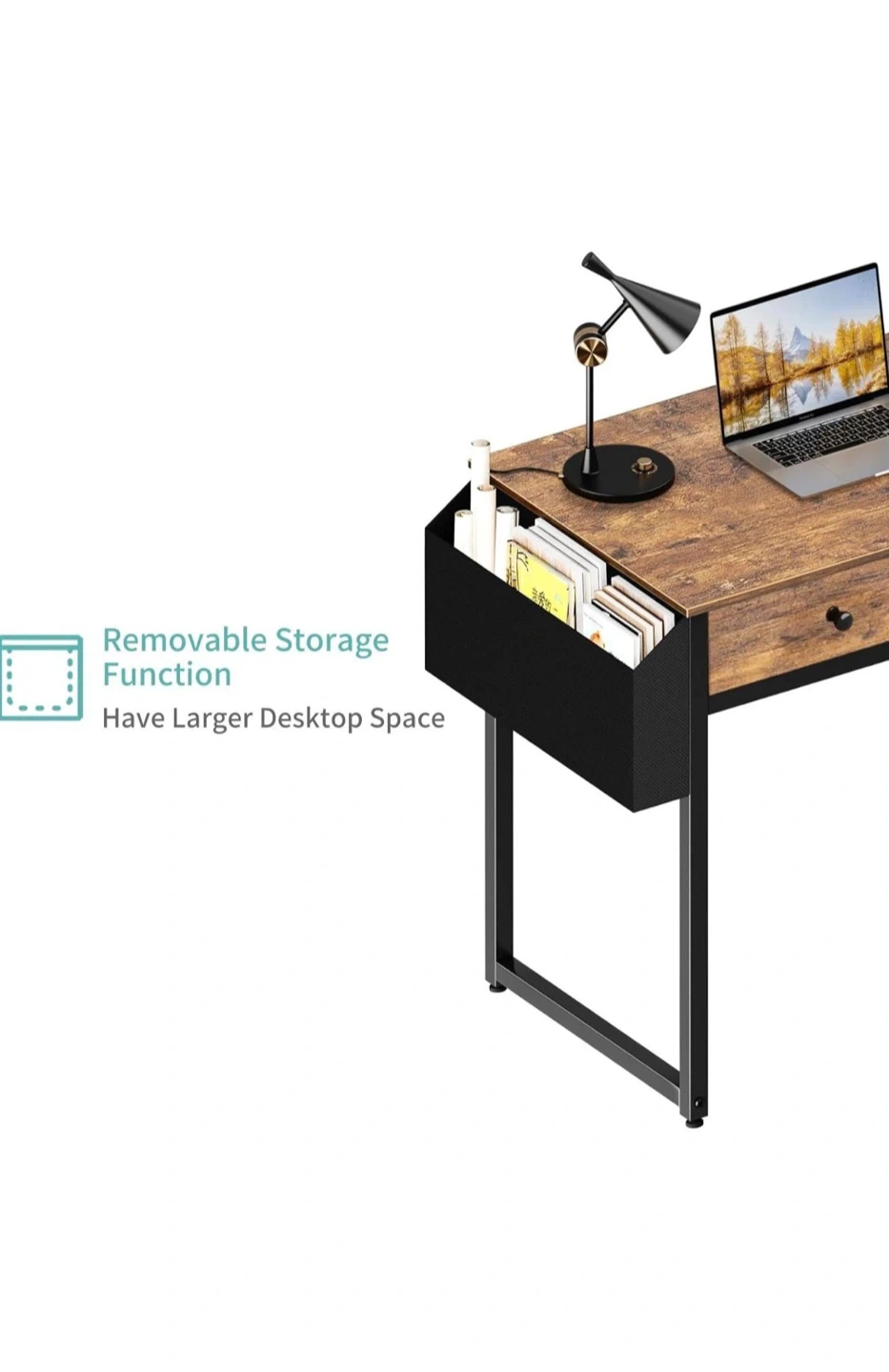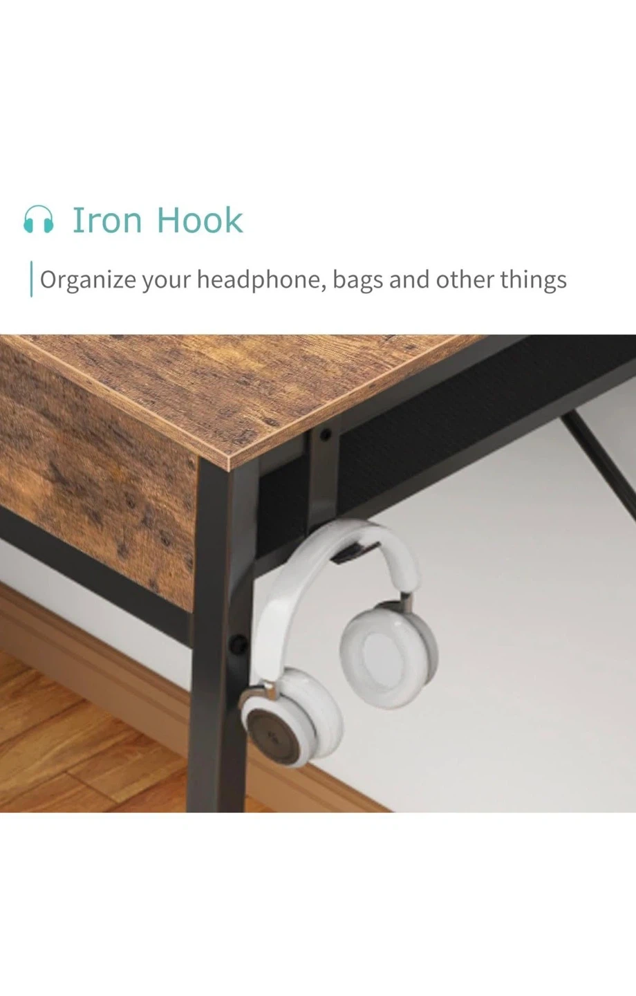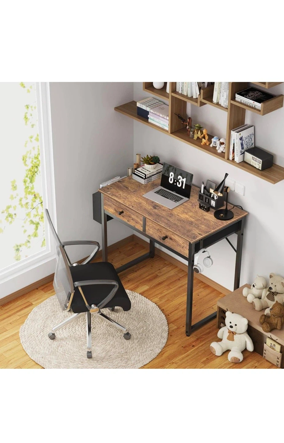 Looking to sell this rustic brown computer desk! It features a heavy-duty metal design and two fabric drawers. The dimensions are: - 31.5" wide - 15.7" deep - 31" high It's durable, sturdy, and in great condition!