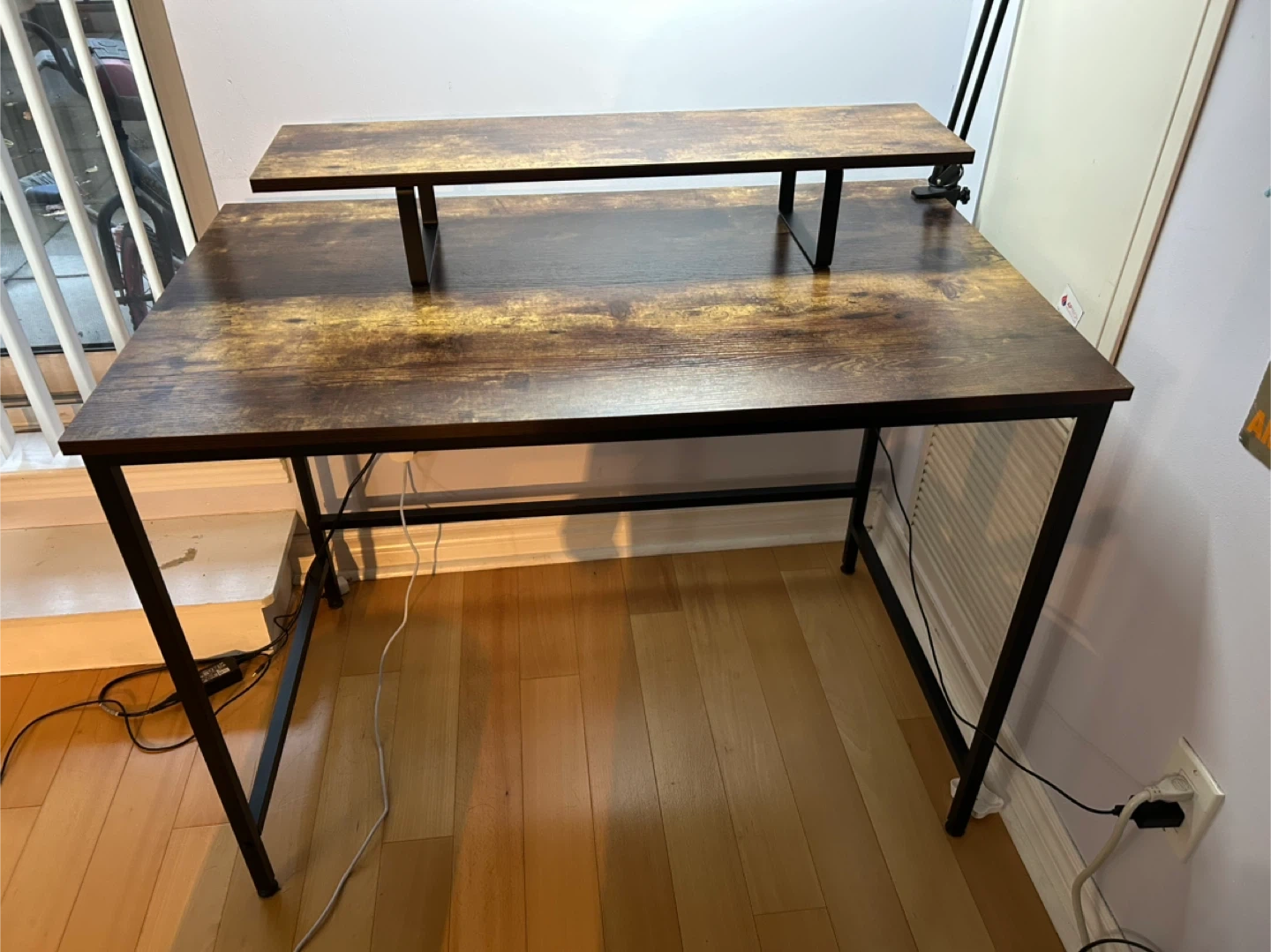 10Selling a rustic brown computer desk that comes with a monitor shelf! It's in great condition and perfect for a home office setup. The desk has a sturdy black metal frame and a wood-grain top, offering a stylish and functional workspace. The monitor shelf helps to keep your desk organized and clutter-free