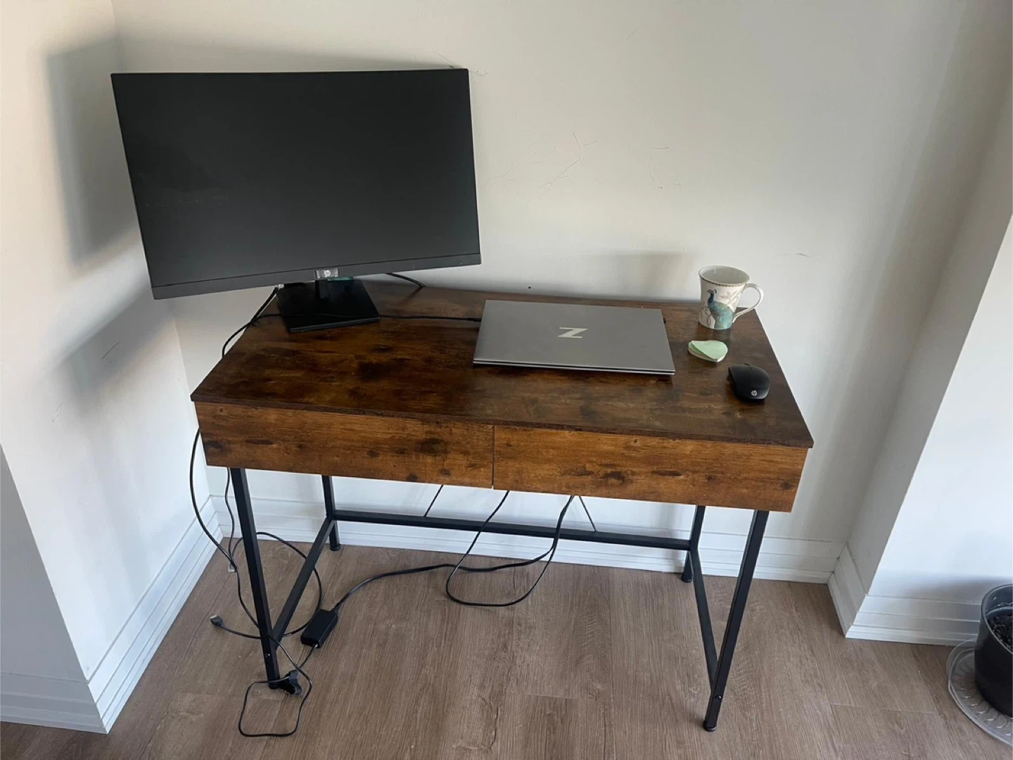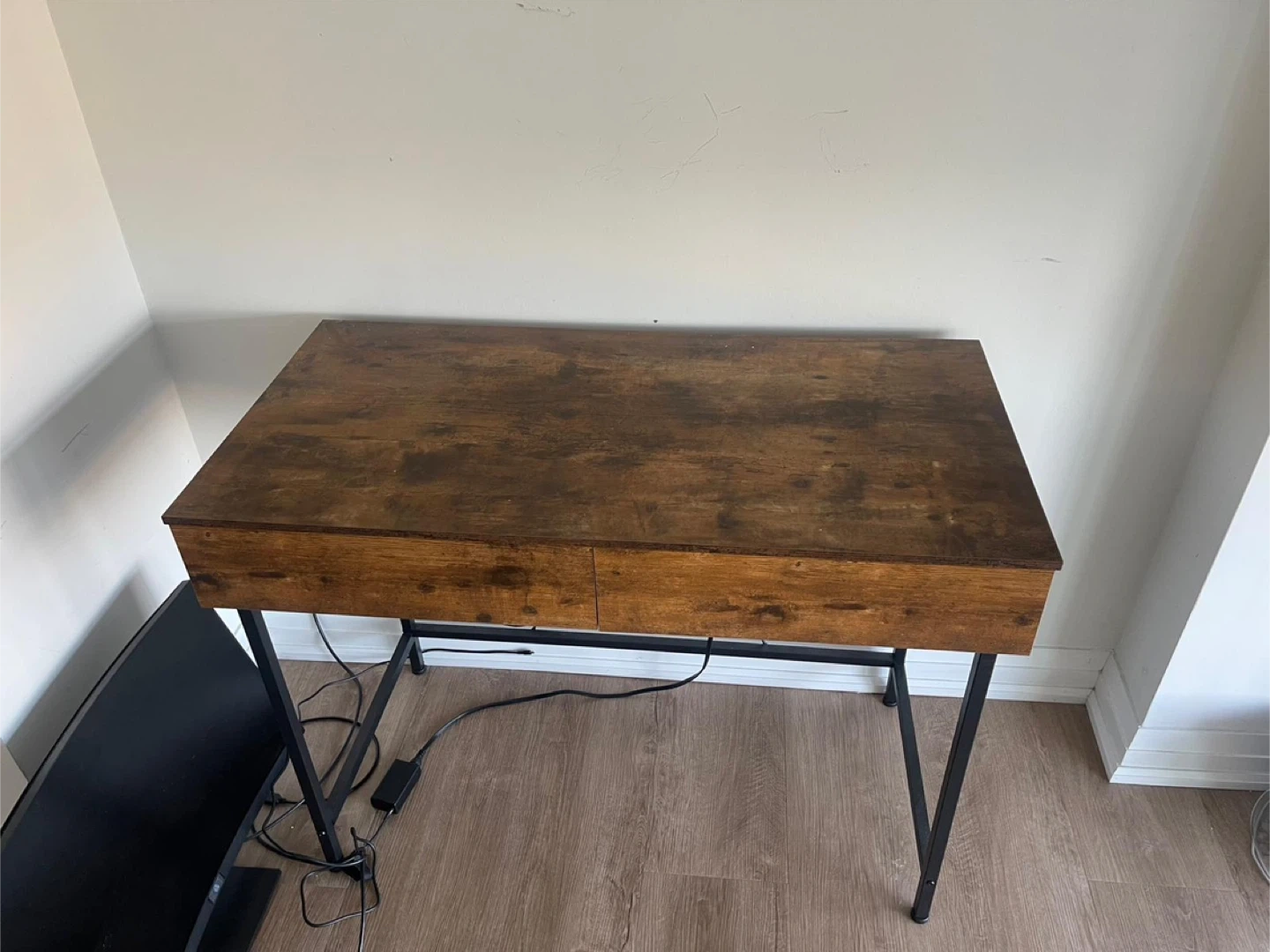 73Selling a rustic brown desk with black metal legs. It's in great condition and would be perfect for a home office or study space. It features a smooth wooden surface and two drawers for storage. The desk is sturdy and stylish, adding a touch of warmth to any room