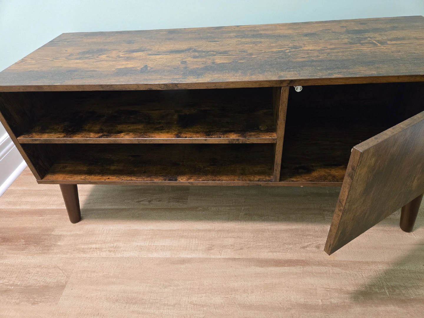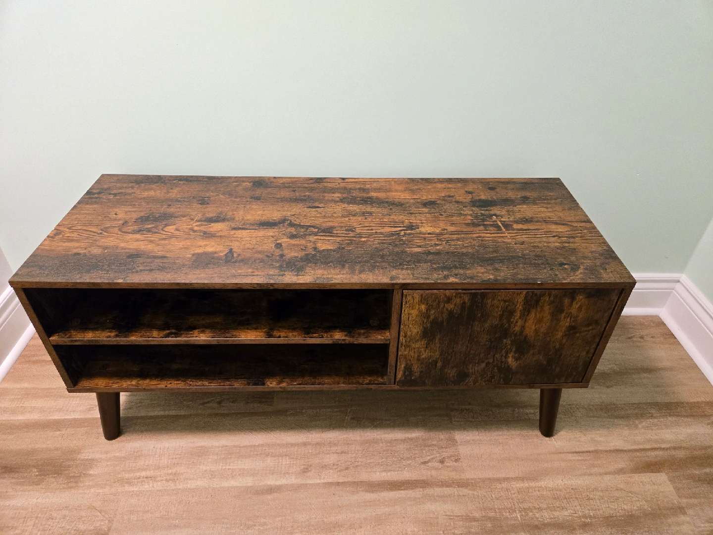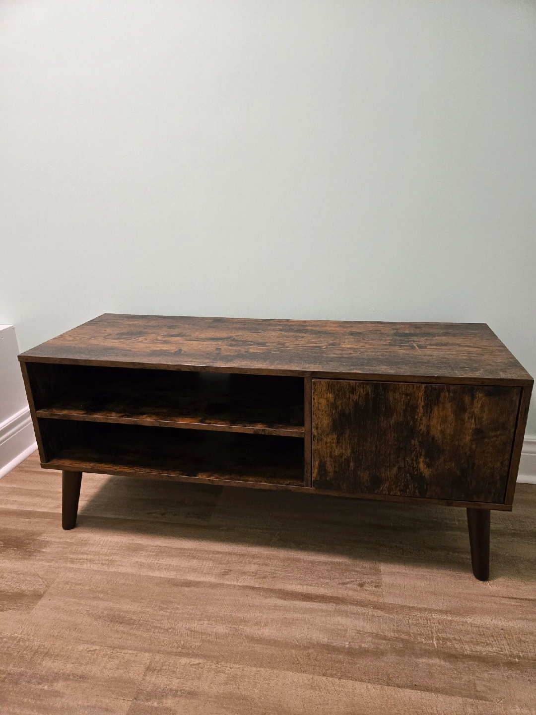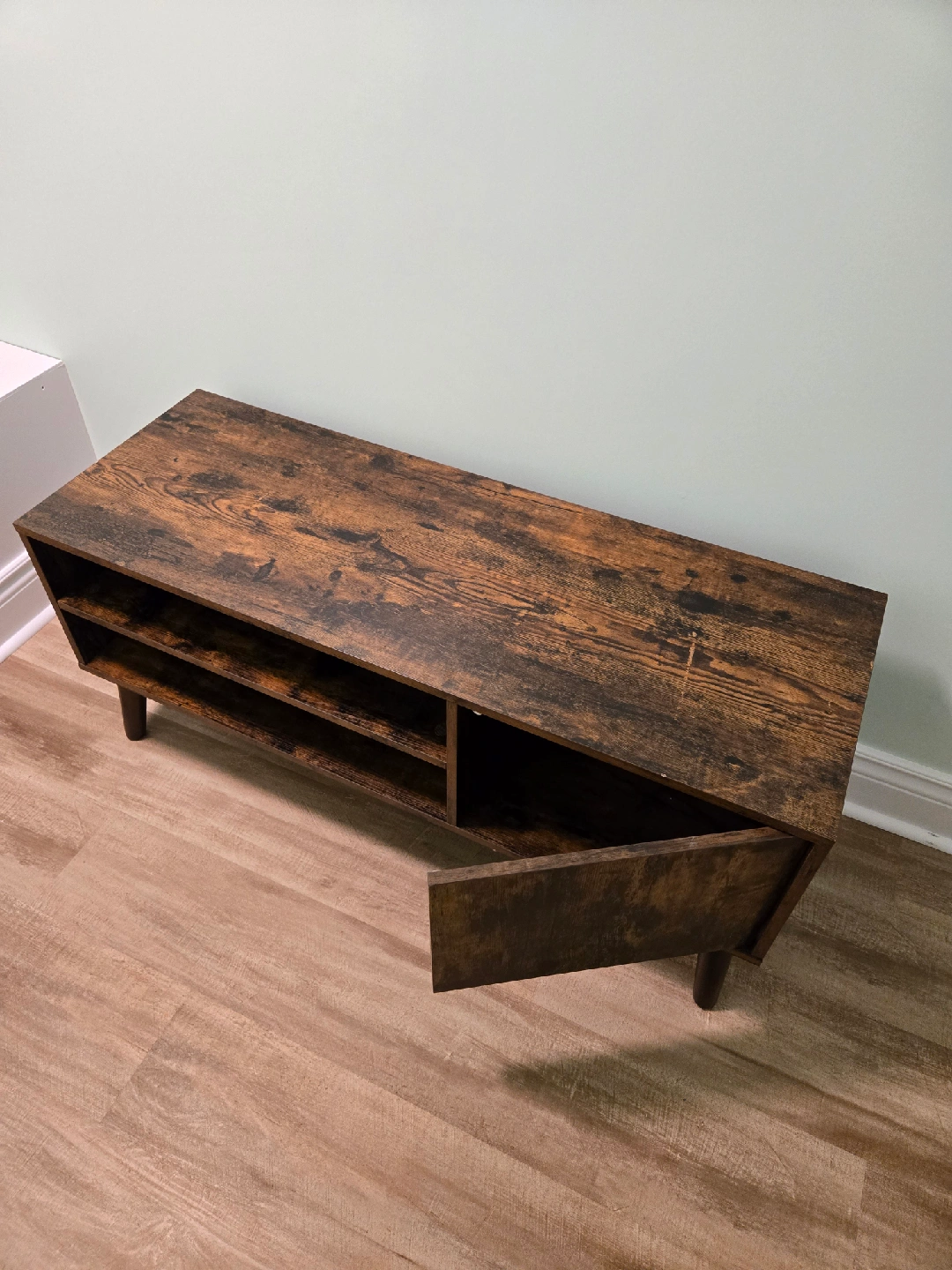 68Selling a rustic brown TV stand or media console. It features a cabinet door and open shelving for storage. It has a wood-grain finish and a mid-century modern style. There are some minor scratches on the top surface.