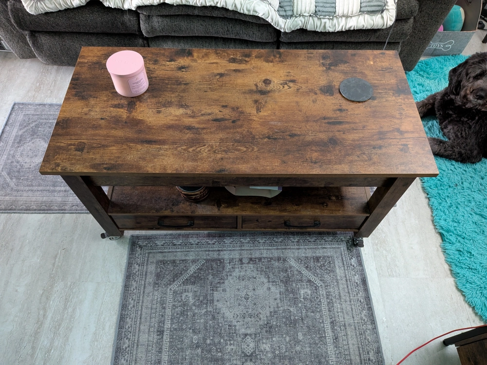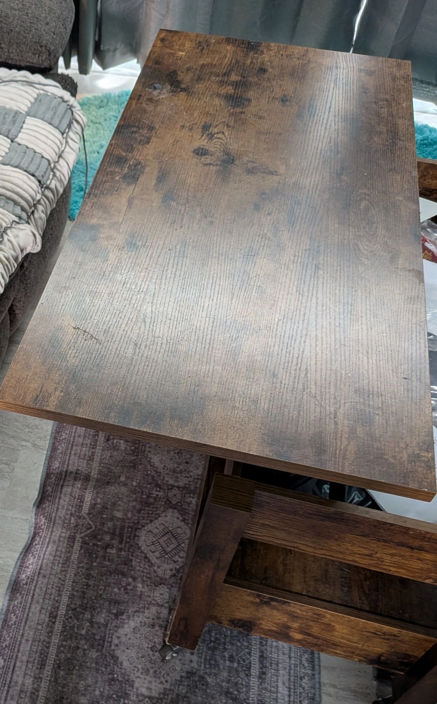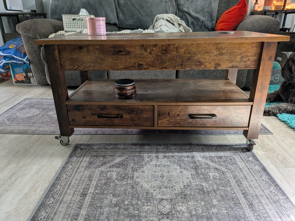 Selling a coffee table with a rustic brown wood finish. It has a convenient storage shelf underneath and two drawers, as well as a flip up top with ample storage inside, perfect for keeping things organized. It's on wheels, so it's easy to move around too