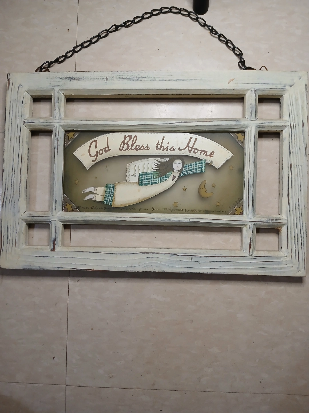 20A charming rustic wall decor piece featuring the phrase 'God Bless This Home' with an angel design. It has a distressed white frame and a metal chain for hanging. Perfect for adding a touch of vintage charm to any room!