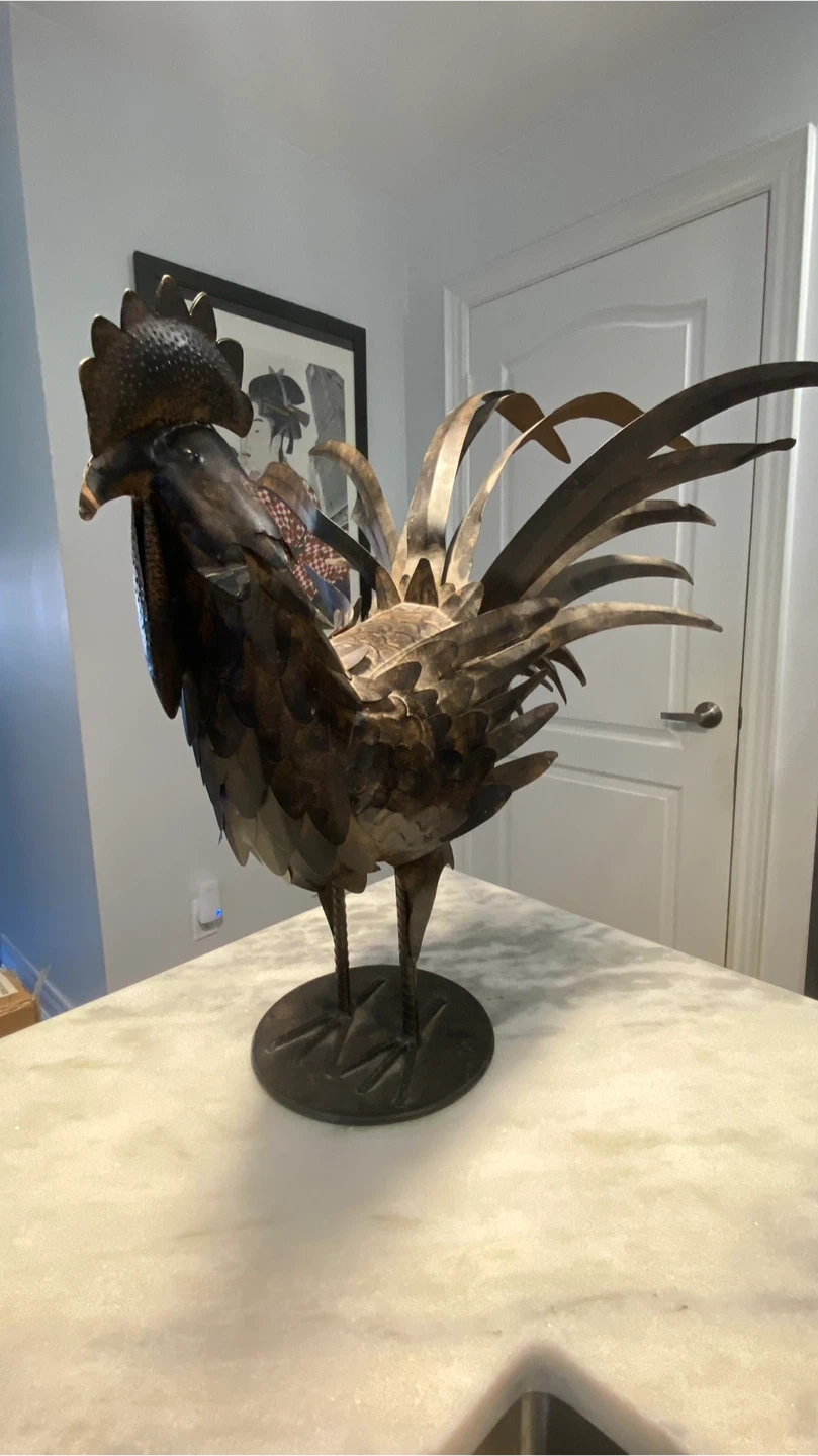This is a rustic metal rooster sculpture that would look great in your home or garden! It's got a unique, industrial look. Made from tin metal this piece is a great home accent for any kitchen.