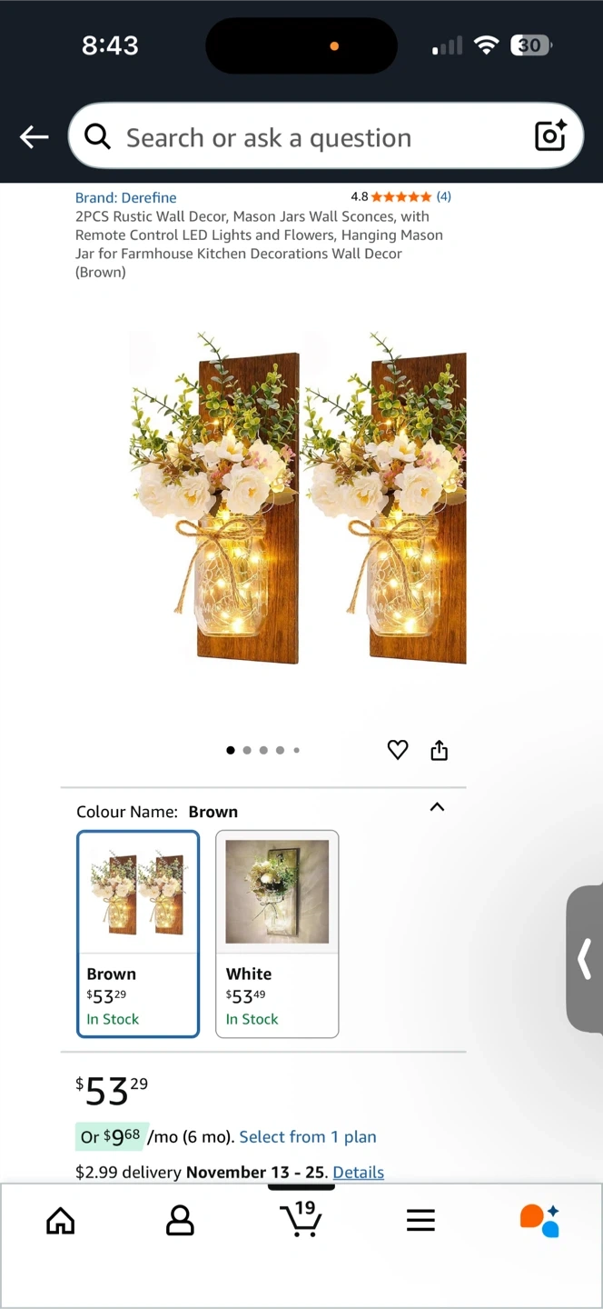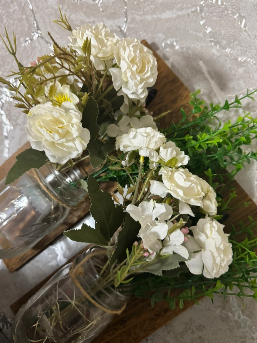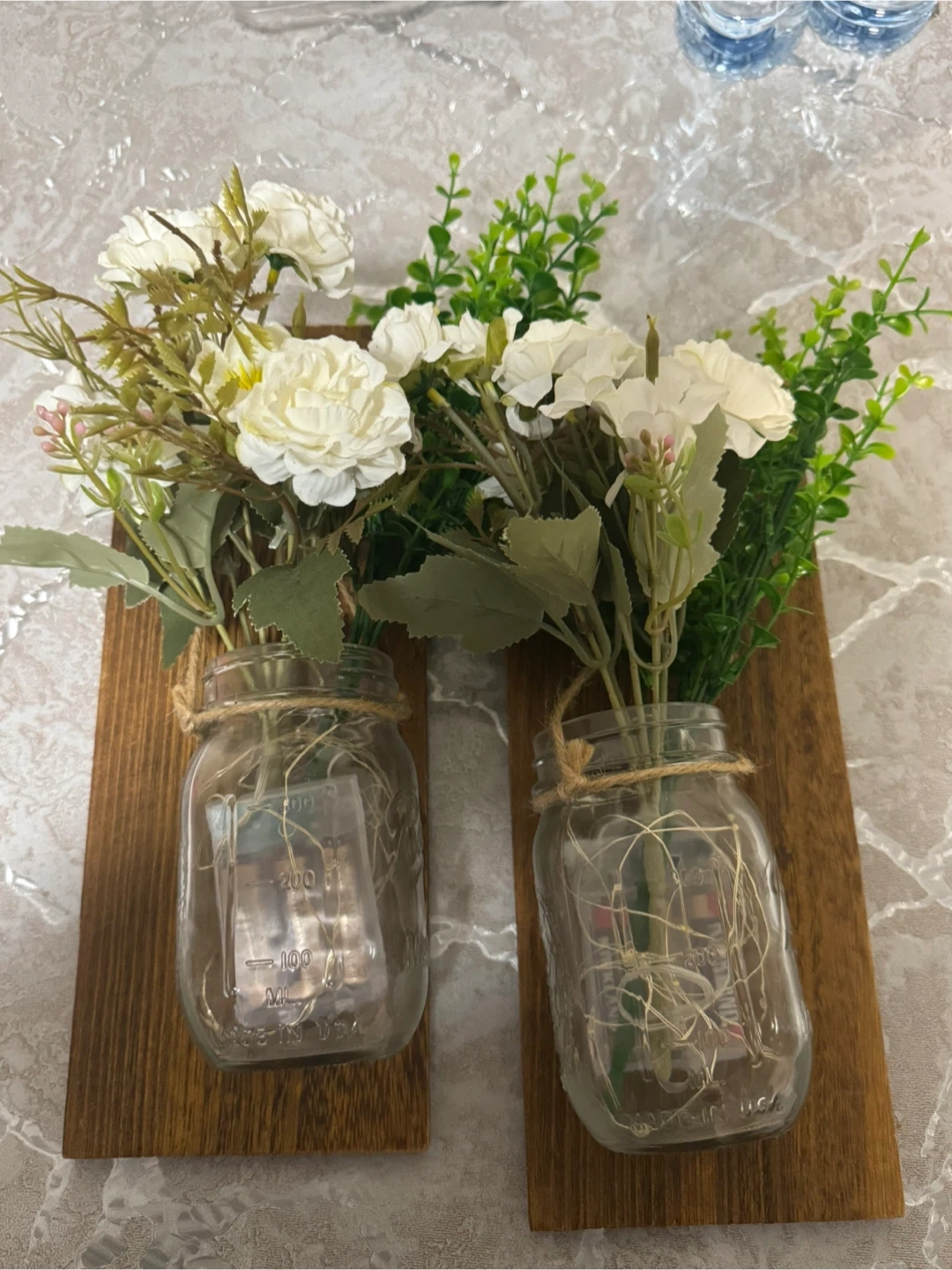 70Selling a set of rustic wall decor mason jar sconces. They feature flowers and remote-controlled LED lights, perfect for adding a farmhouse touch to your kitchen or living room. Originally bought for $53.29