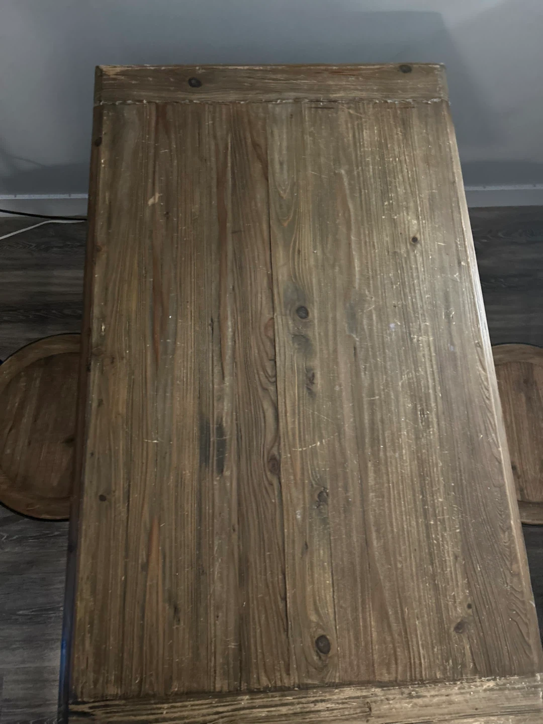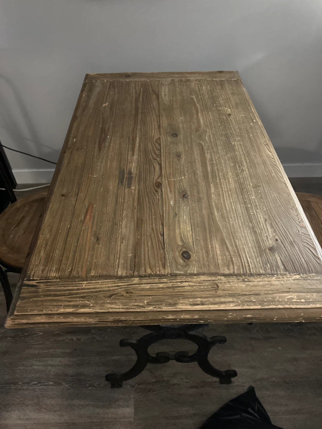 65Selling a rustic dining table with a set of chairs. The table has a beautiful wood grain finish and a sturdy base. The chairs have wooden seats and metal frames. They would be a great addition to any dining space!