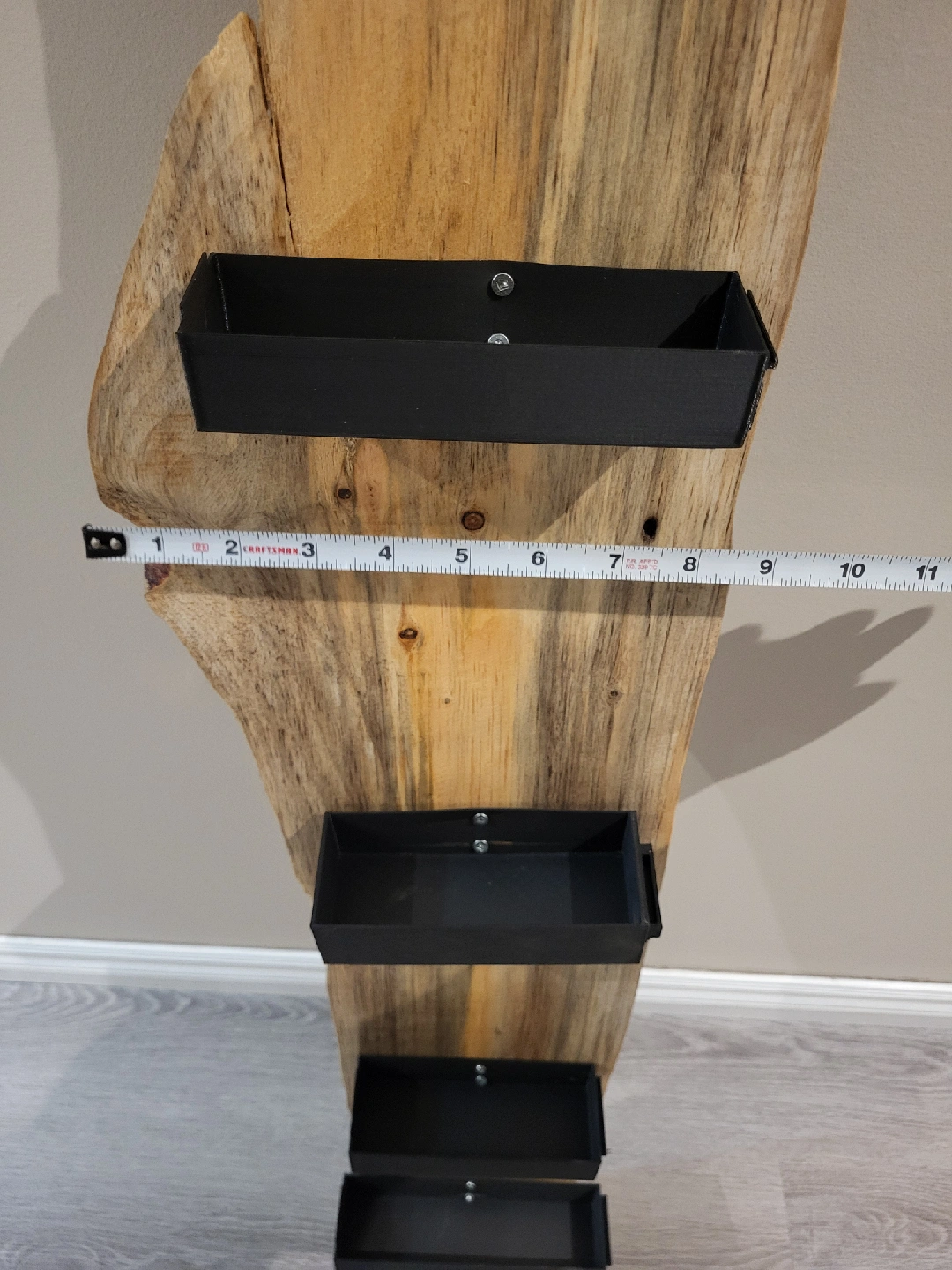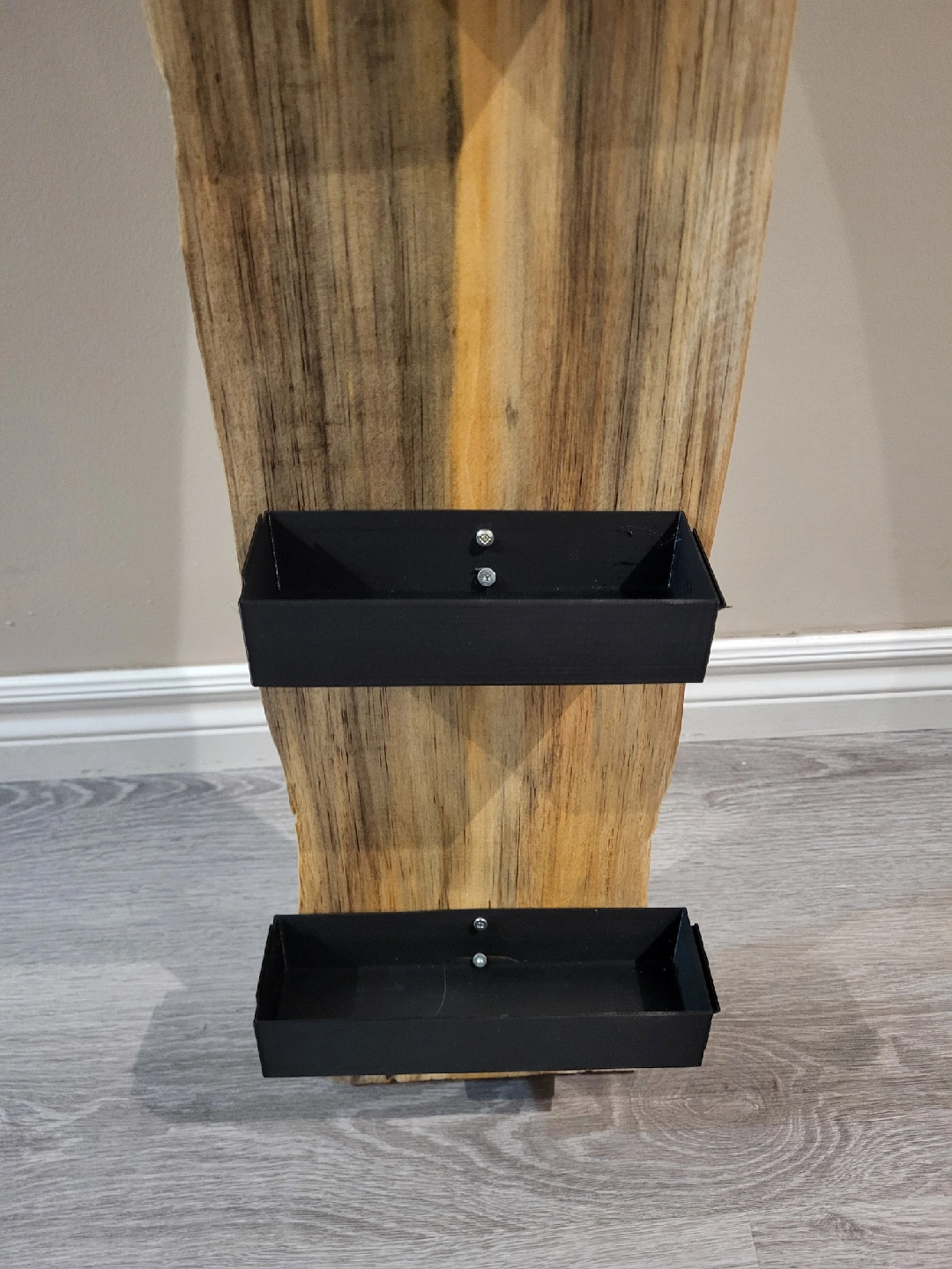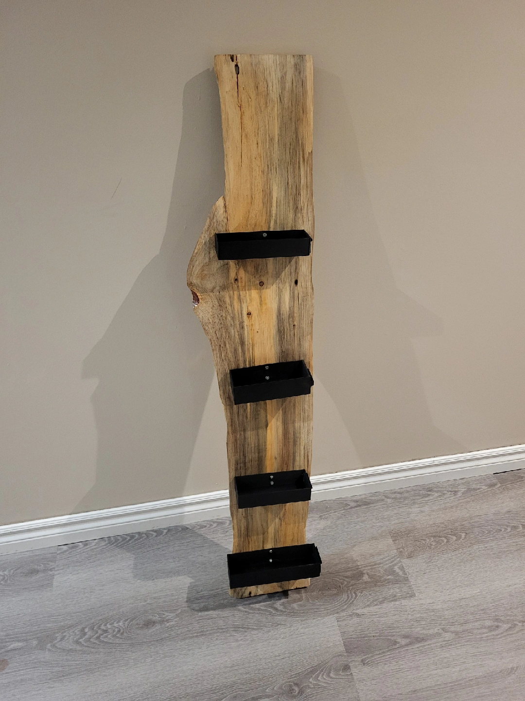 Check out this unique rustic shelf! It's made from a beautiful piece of natural wood and features four sturdy black plastic baskets. Perfect for adding a touch of nature and organization to any room. The shelf is approximately 44 inches tall and the baskets vary slightly.