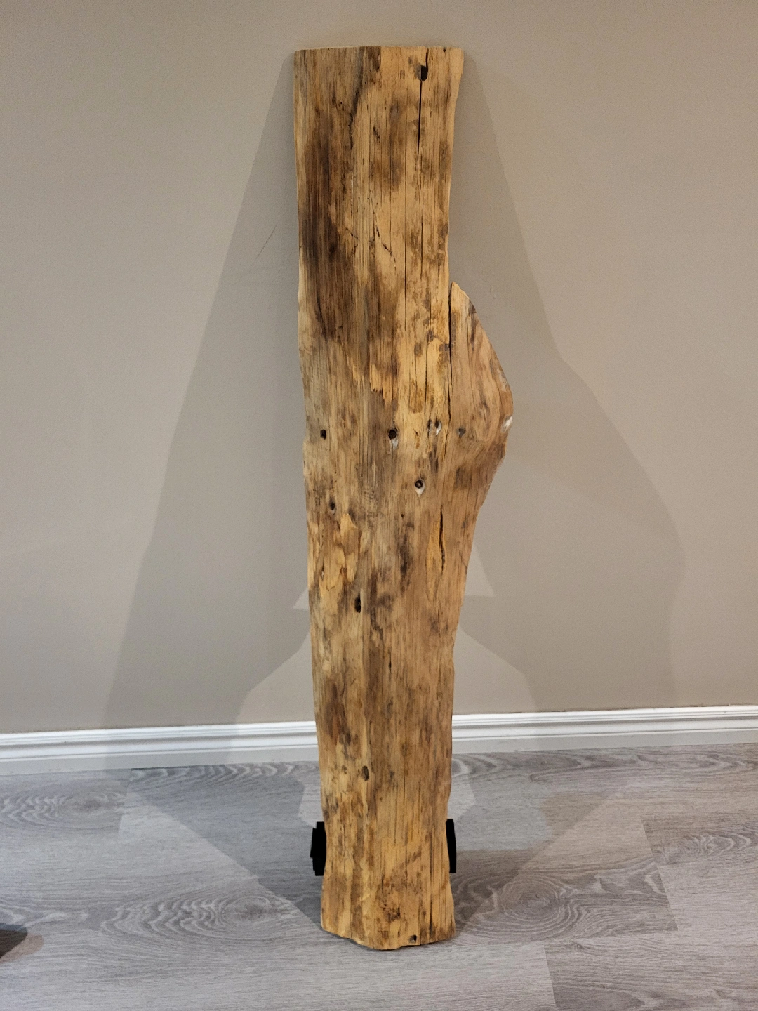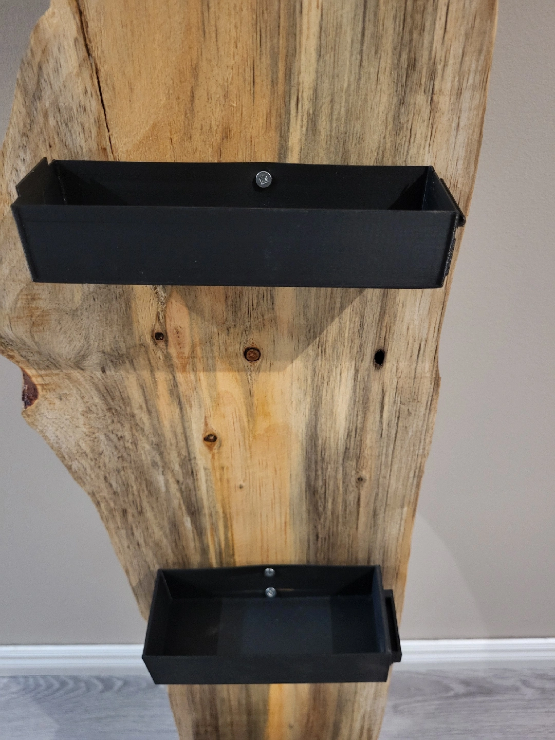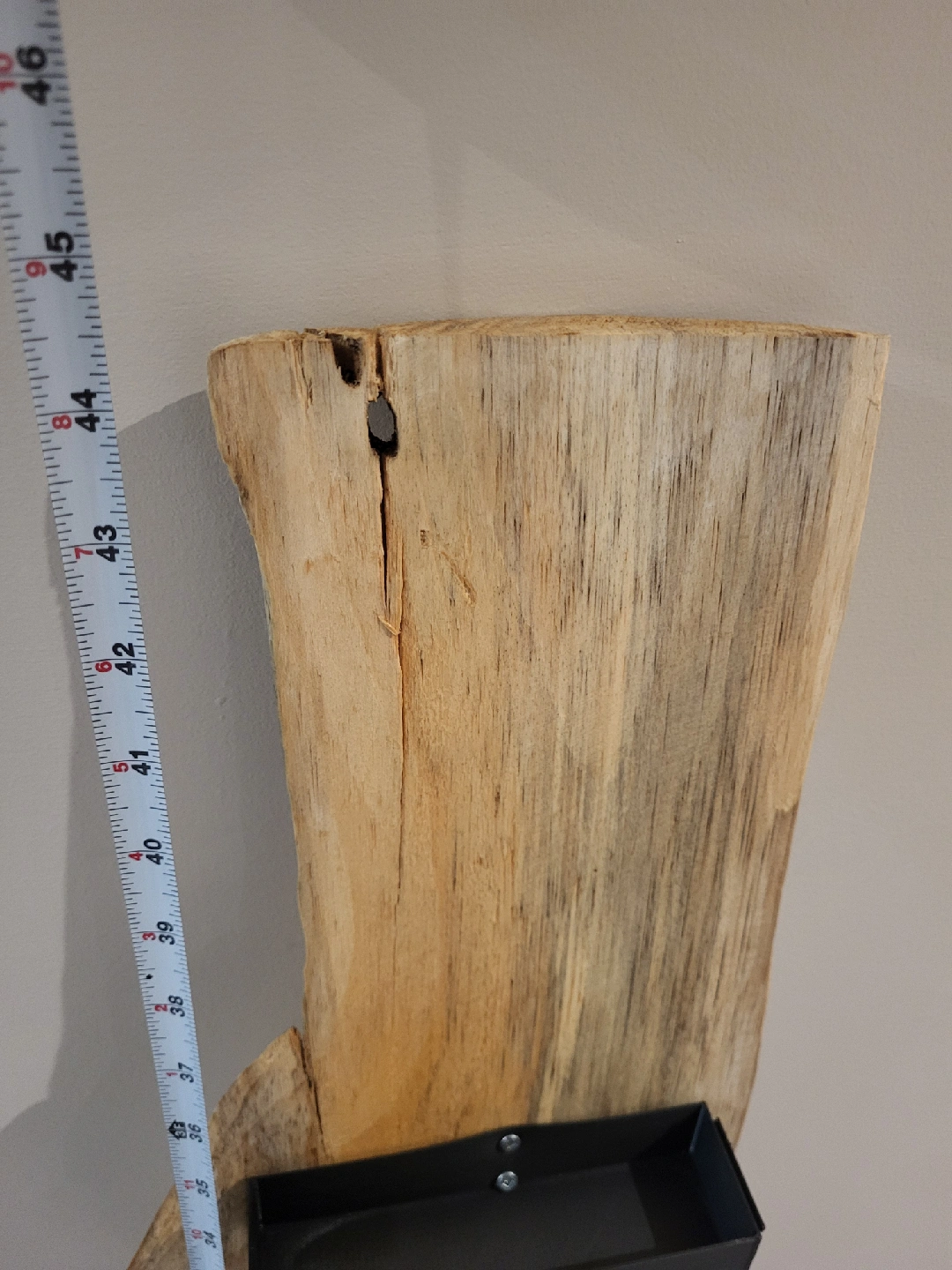 Check out this unique rustic shelf! It's made from a beautiful piece of natural wood and features four sturdy black plastic baskets. Perfect for adding a touch of nature and organization to any room. The shelf is approximately 44 inches tall and the baskets vary slightly.