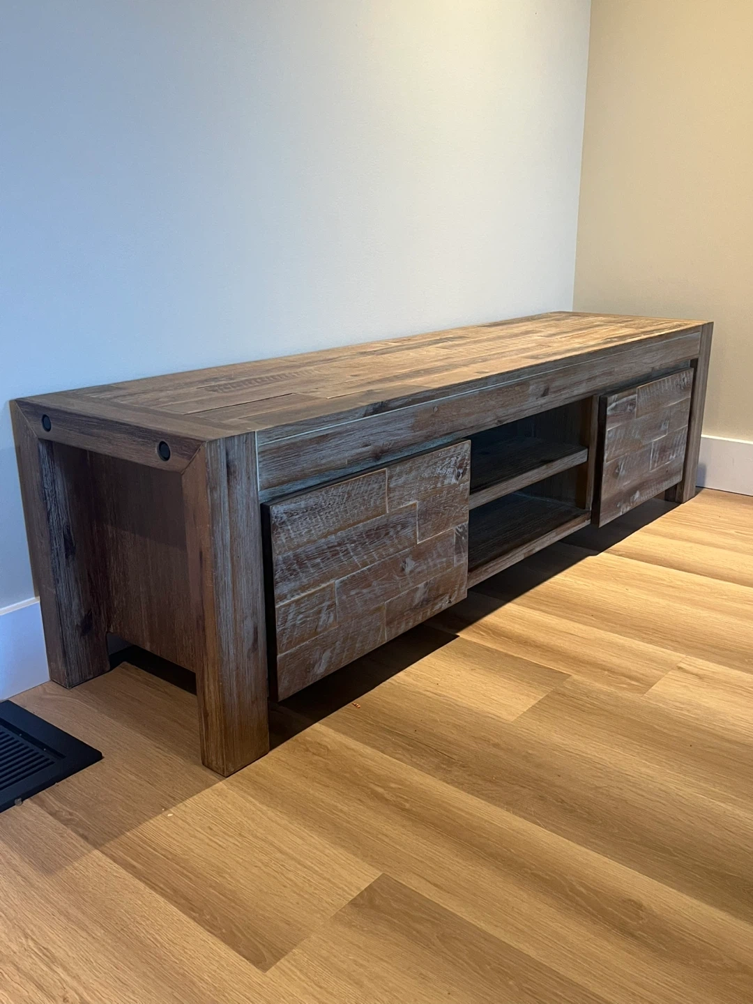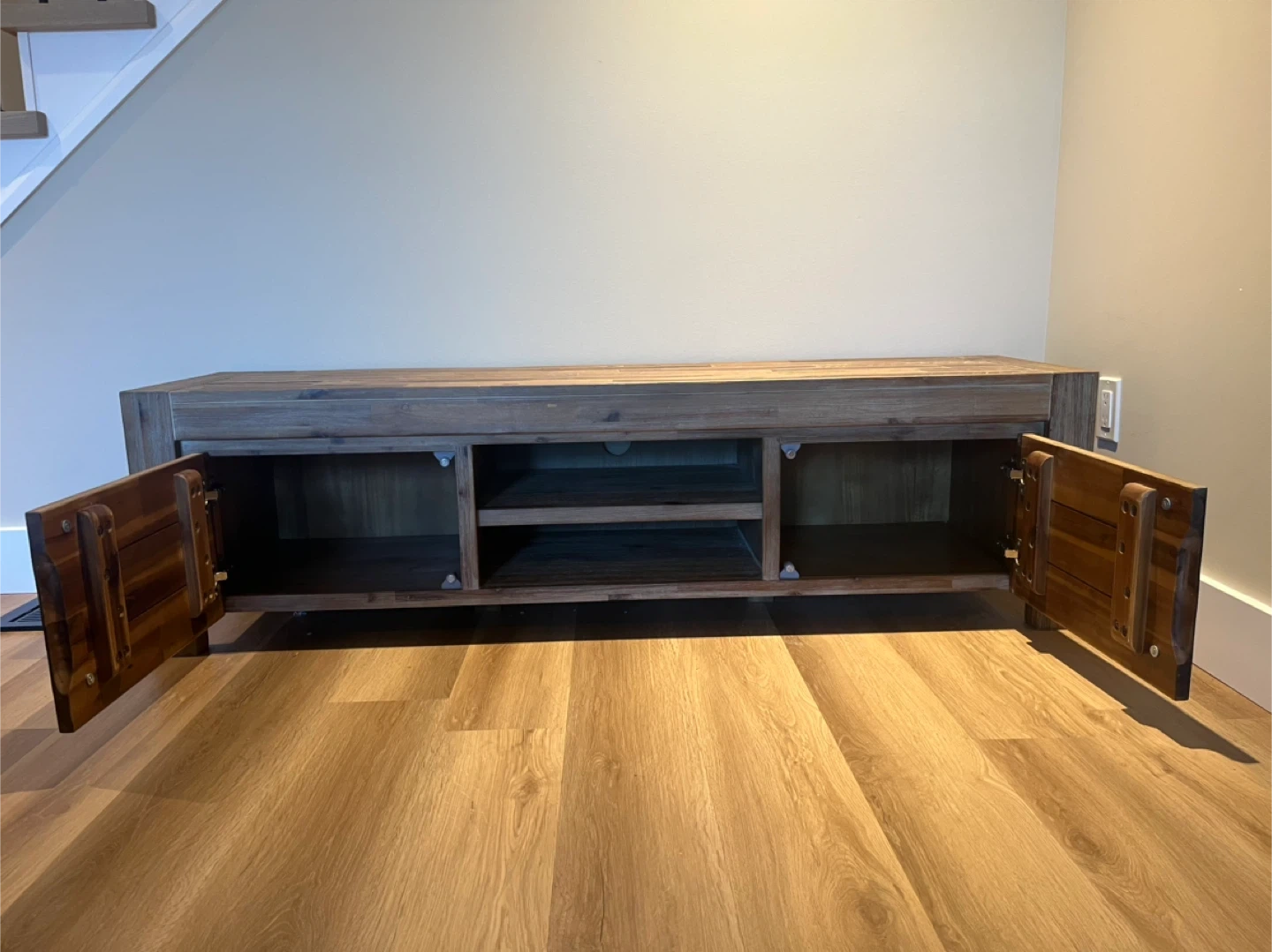 Selling a rustic wood TV stand or media console. It has a beautiful, natural wood finish that would look great in any living room. It features open shelving and cabinets for storage. Perfect for organizing your entertainment setup!