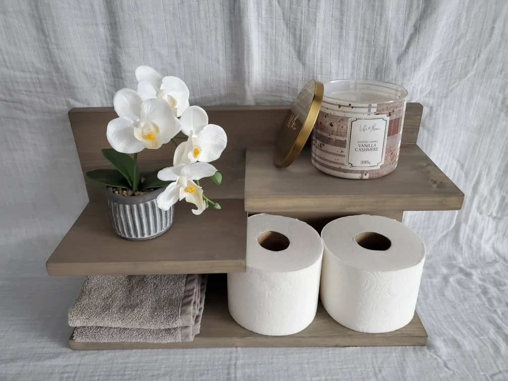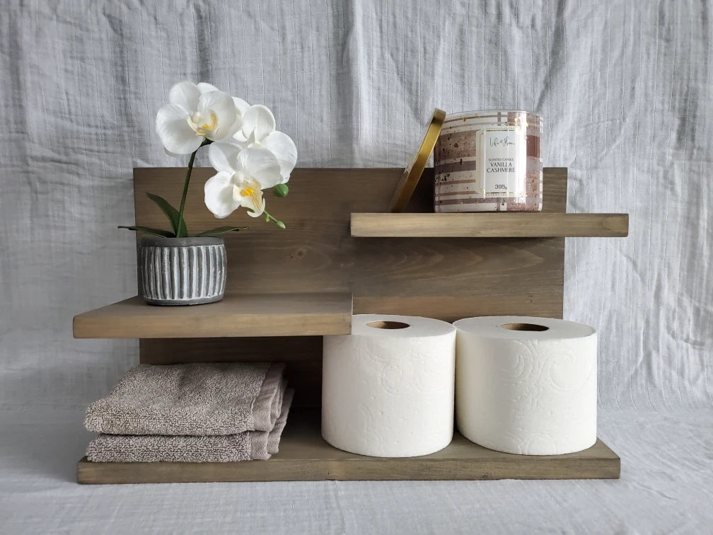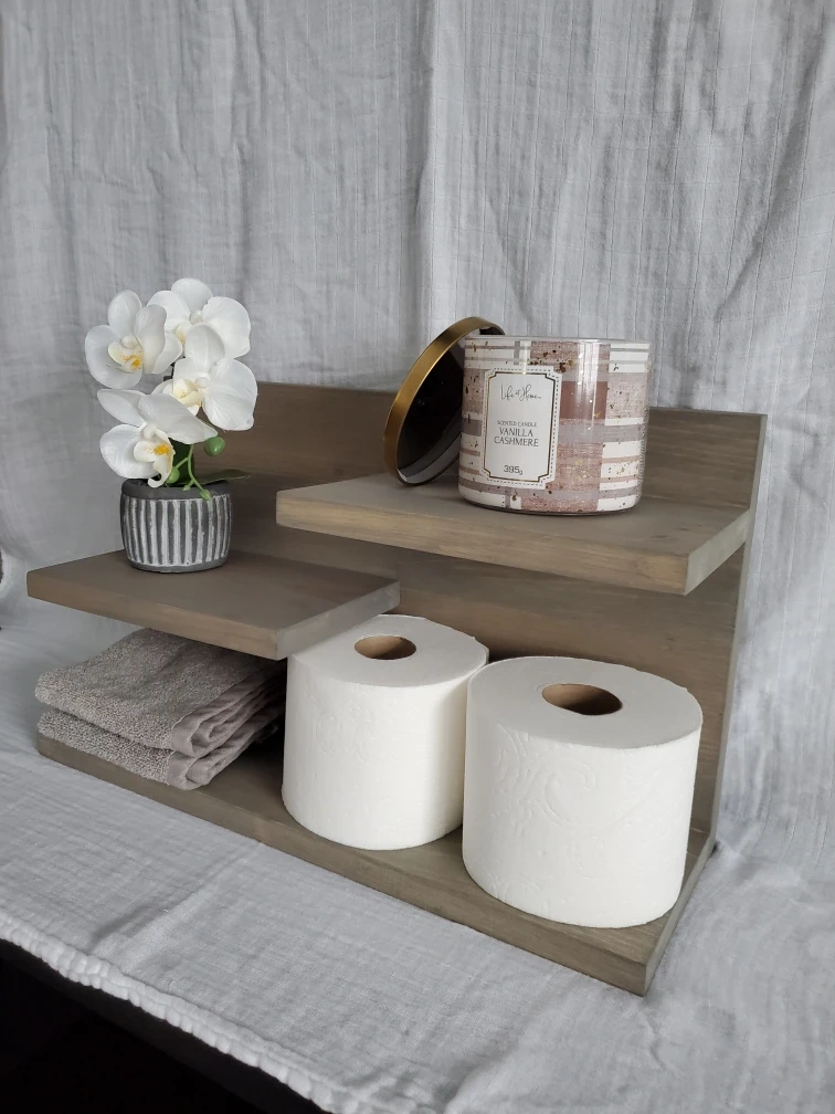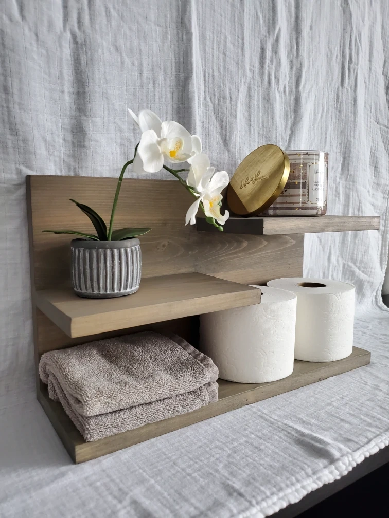 Wooden bathroom floating shelf. Perfect for storing bathroom essentials like towels, toilet paper, and decor. They measure 18" long x 11" high x 5.5" deep. Can be customized in colour. Order yours today!