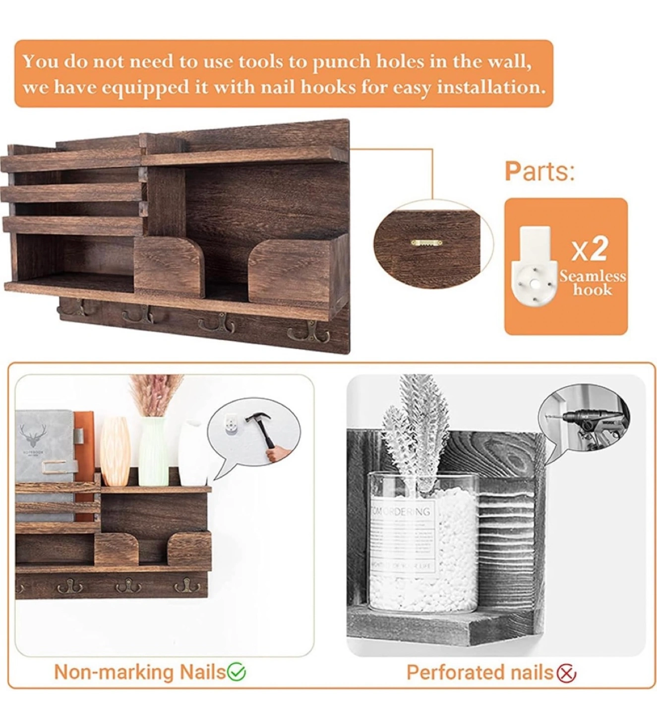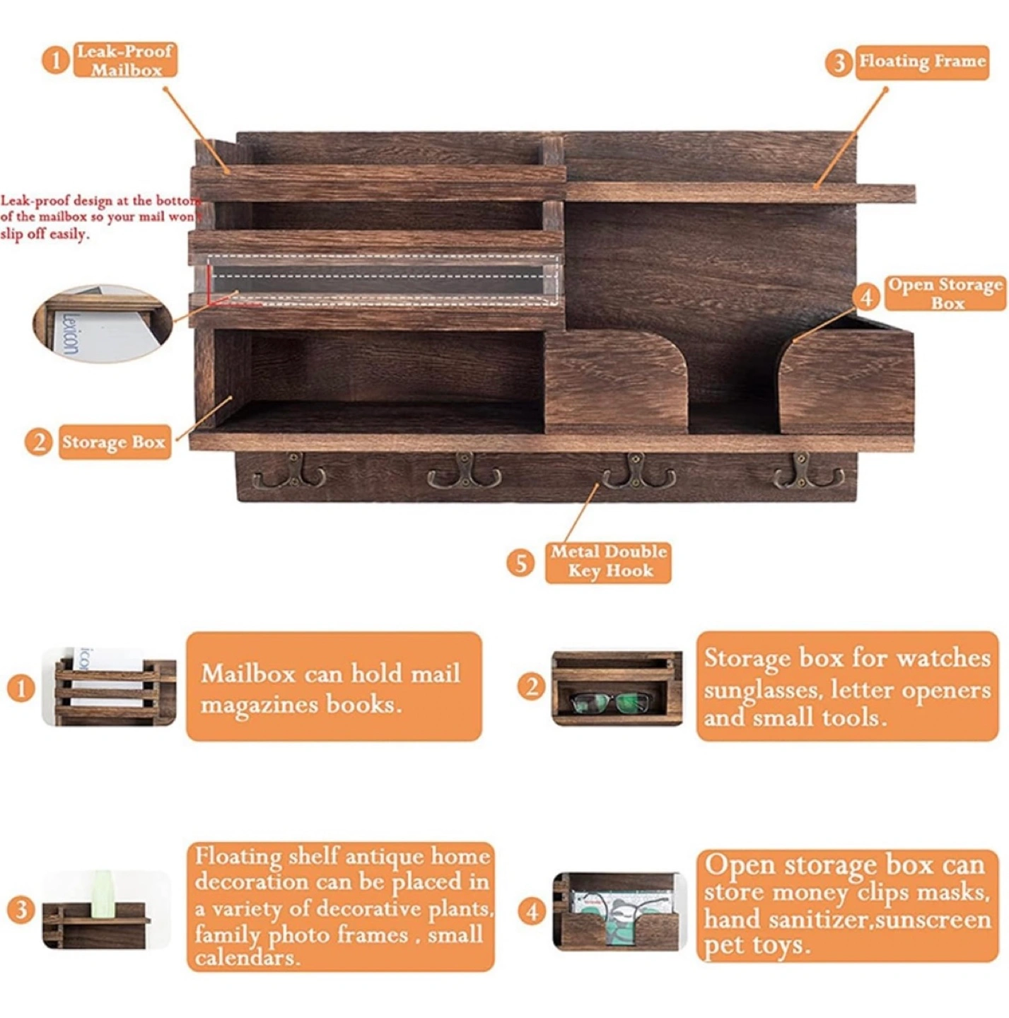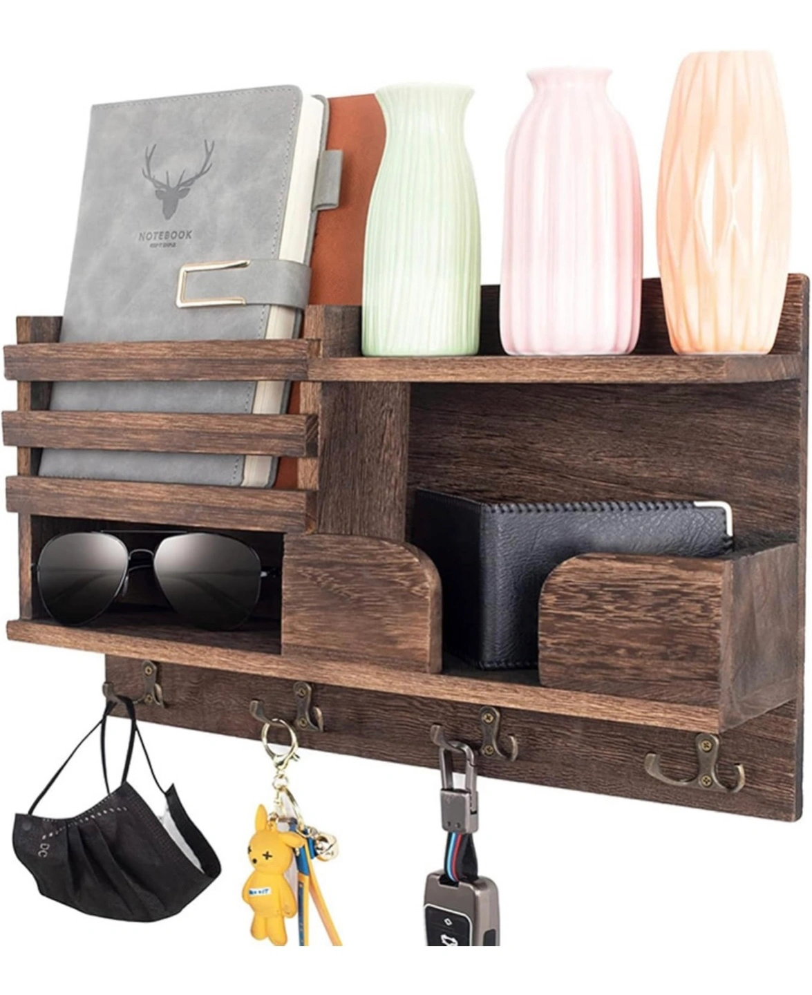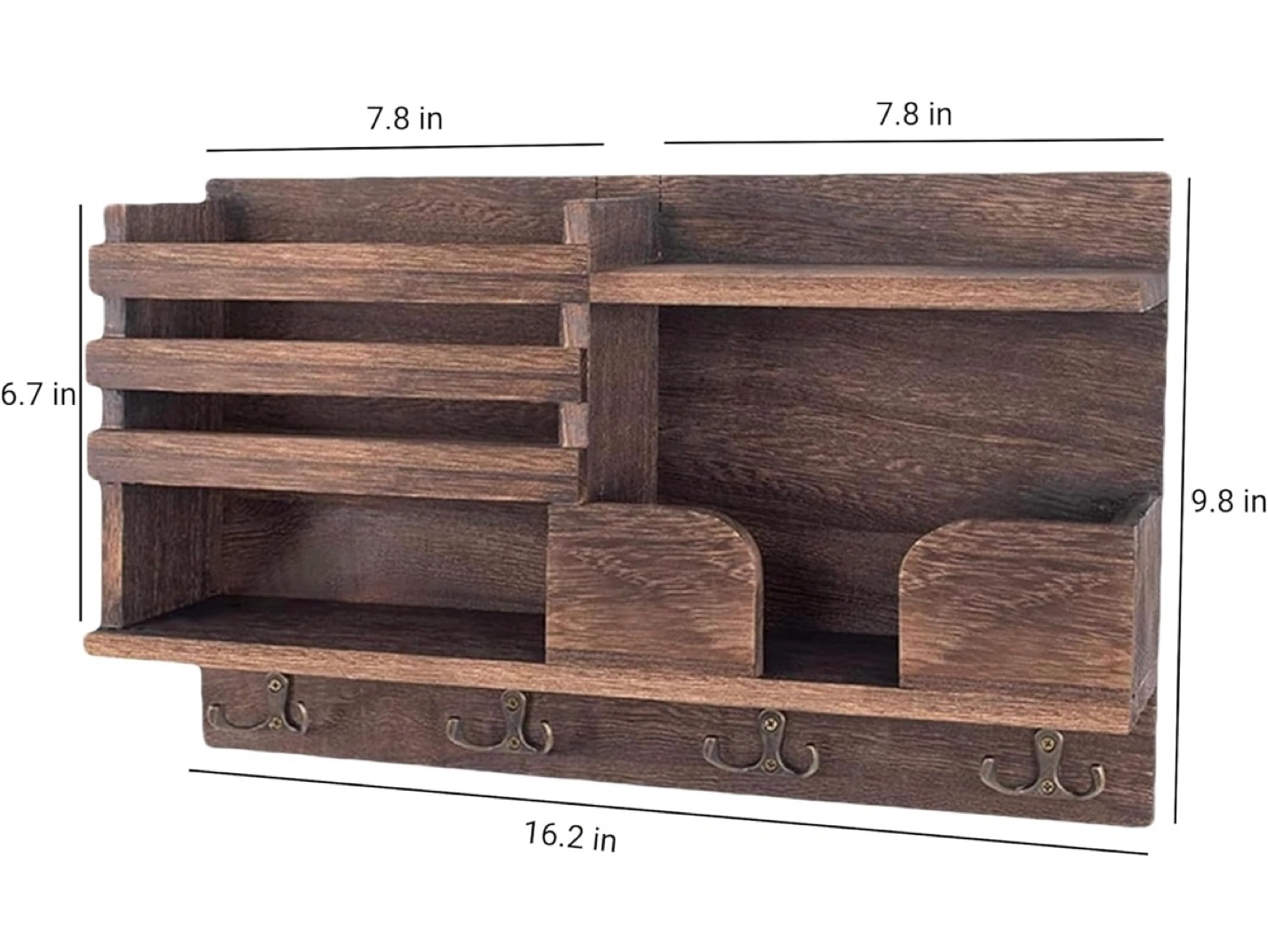 Functional wall organizer. Features shelves, mail slots, and key hooks. Perfect for entryways or offices. Dark brown wood finish. Easy installation.