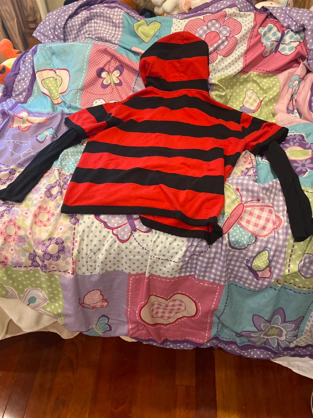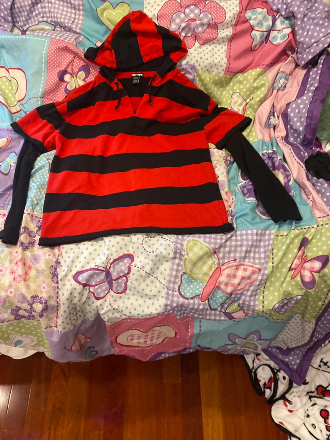 Selling a cool red and black striped design! It has long black sleeves attached to a short-sleeved hoodie, making it a unique piece for layering. It's a size large and in great shape!