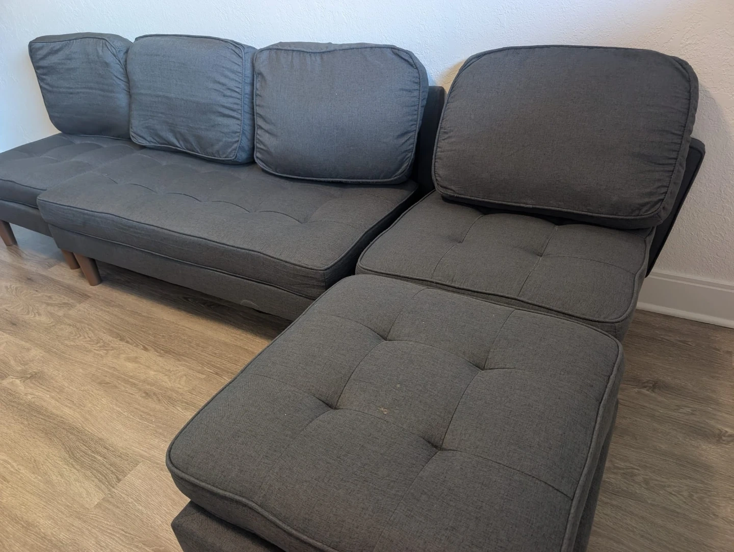 This sectional sofa is upholstered in a dark grey fabric with tufted seat cushions. It includes a matching ottoman that can be used as a footrest or extra seating. The modern design fits well in most living spaces. Can accomodate 4-5 people. Sorry, no delivery possible. Available for viewing.