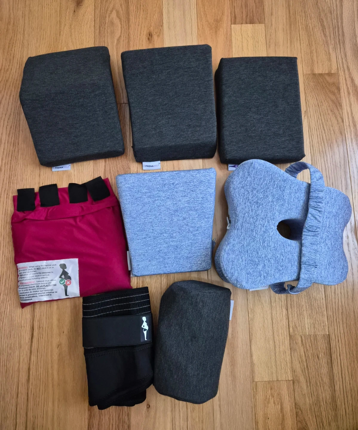 Prena Belt Support System, includes 1 belt and 7 accessories for a 3-in-1 function. This system is designed to offer support. Some components are dark grey, others are light grey and magenta. I used only belt when I was full-term. Everything else is in like-new condition.