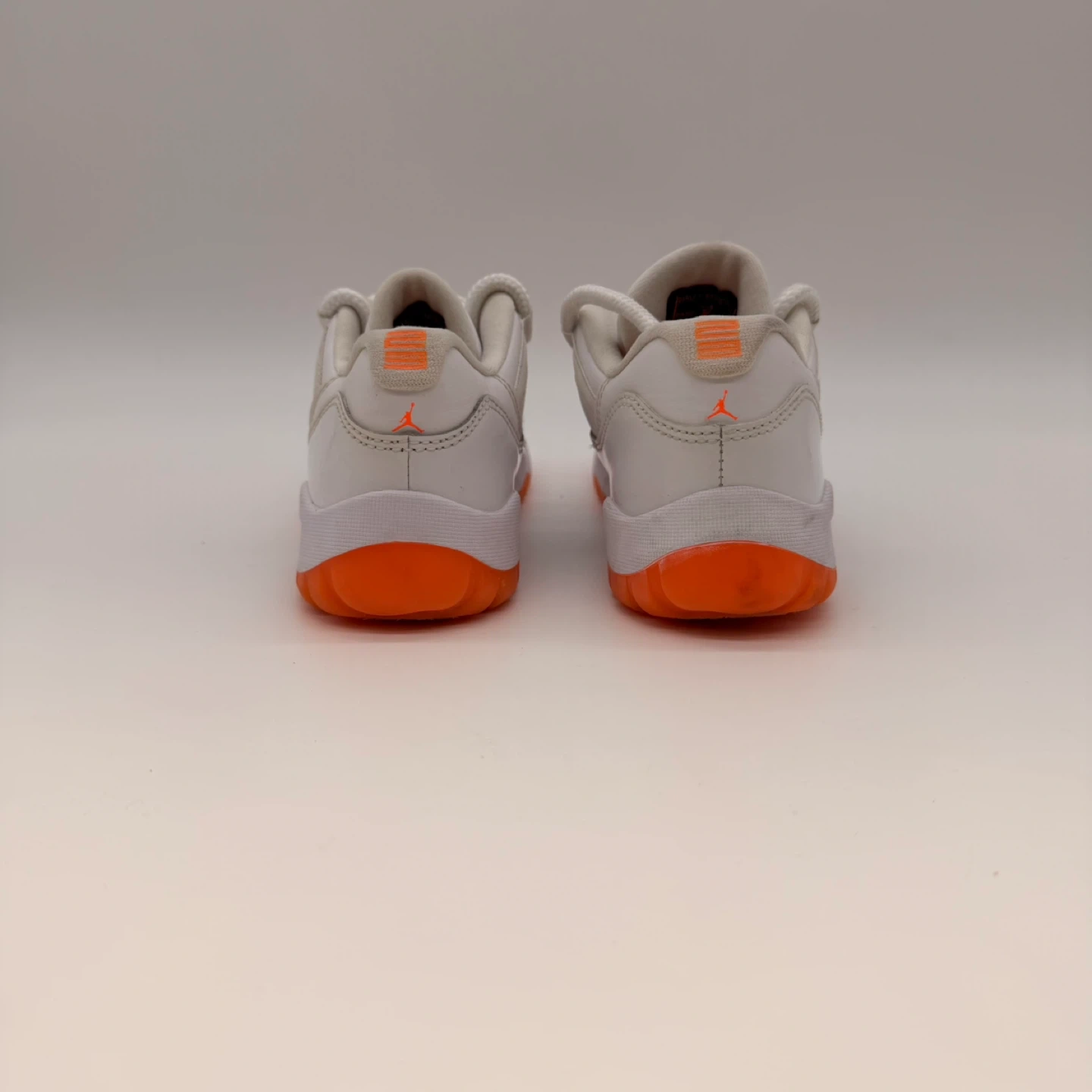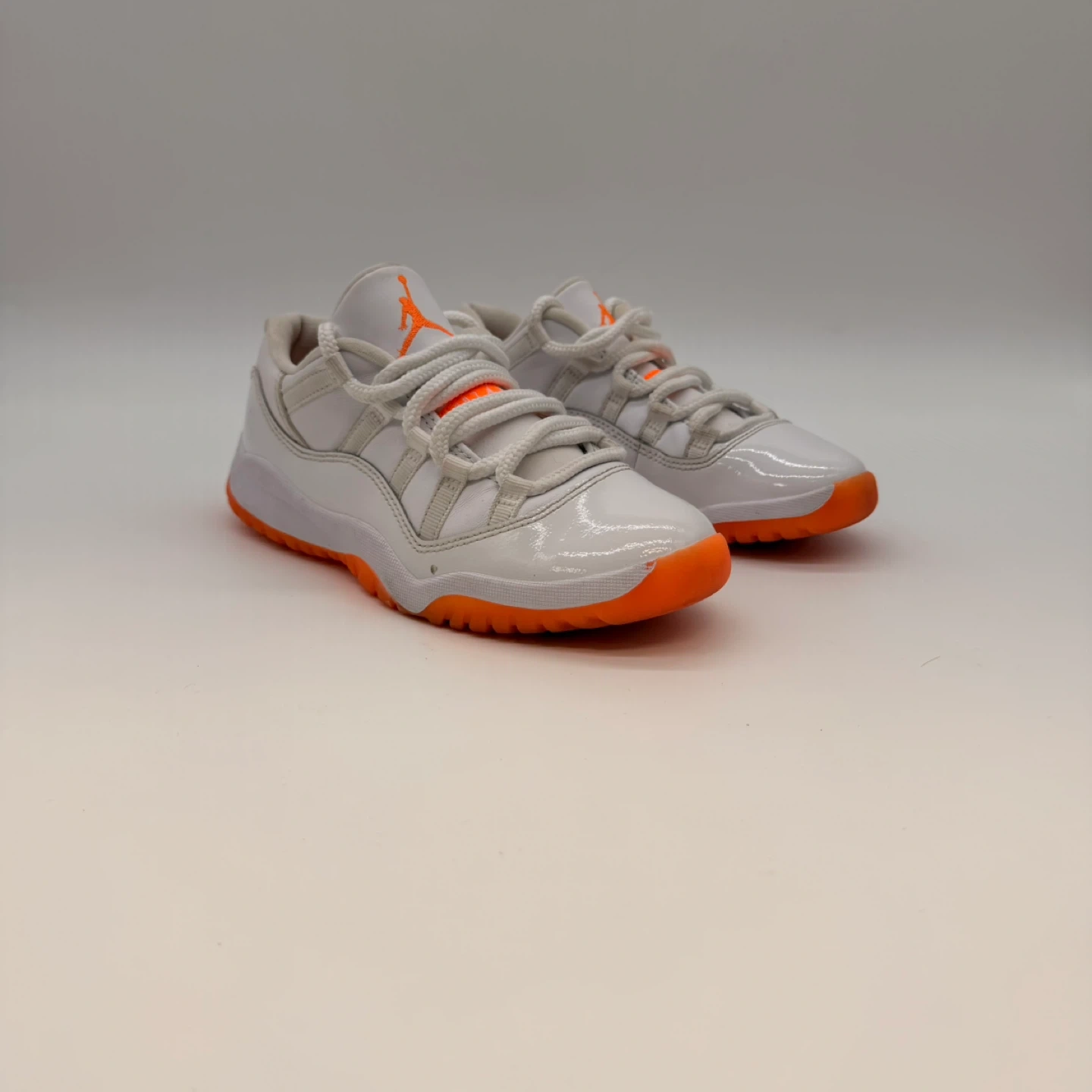 Authentic Nike Air Jordan 11 Retro Low GS sneakers in white with bright orange (citrus) outsole and accents.
